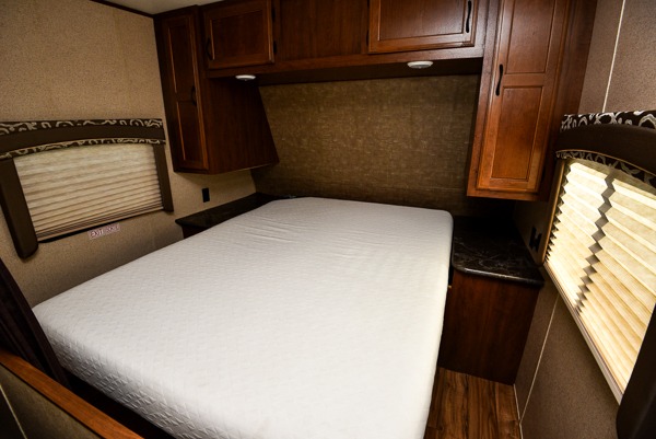 In the front of the trailer has a queen bed with wardrobes on either side of the bed.