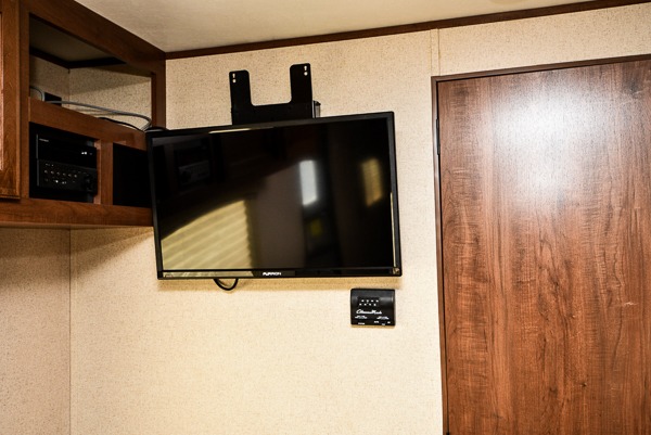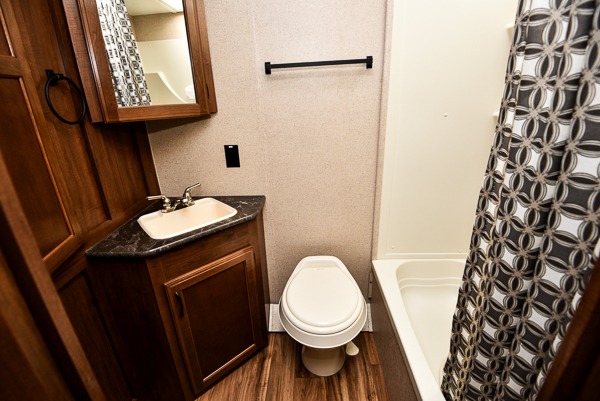 The bathroom is in the rear of the trailer. There is a tub/shower, toilet, sink, and medicine cabinet. You will also find a large wardrobe in the bathroom.