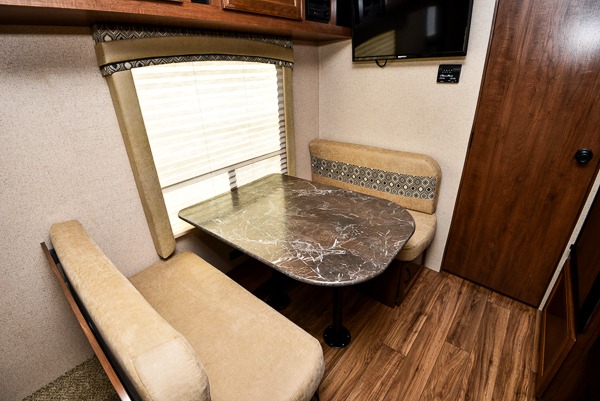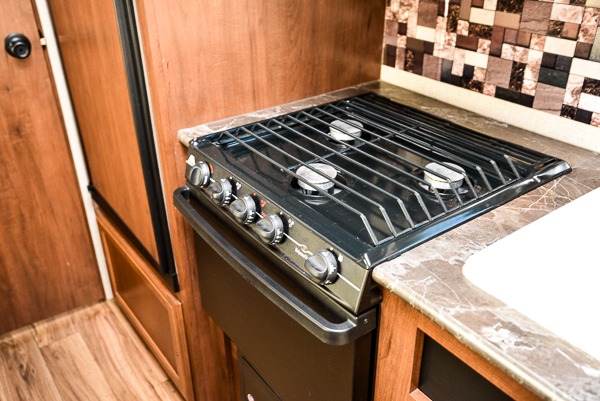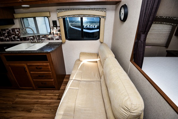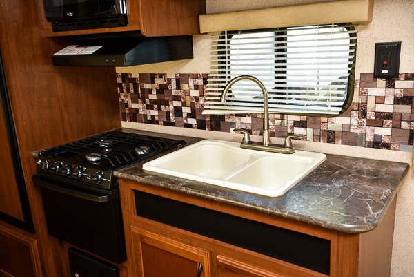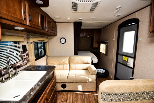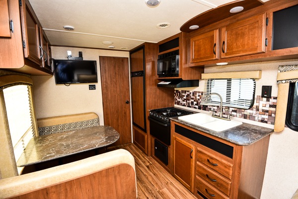 Stepping inside the travel trailer, to the left there is a dinette with an overhead cabinet above. Meals can easily be fixed at the three burner range or microwave, clean up at the double kitchen sink, and food storage for perishables can be placed in the refrigerator. Straight in from the door you will find a sofa.
