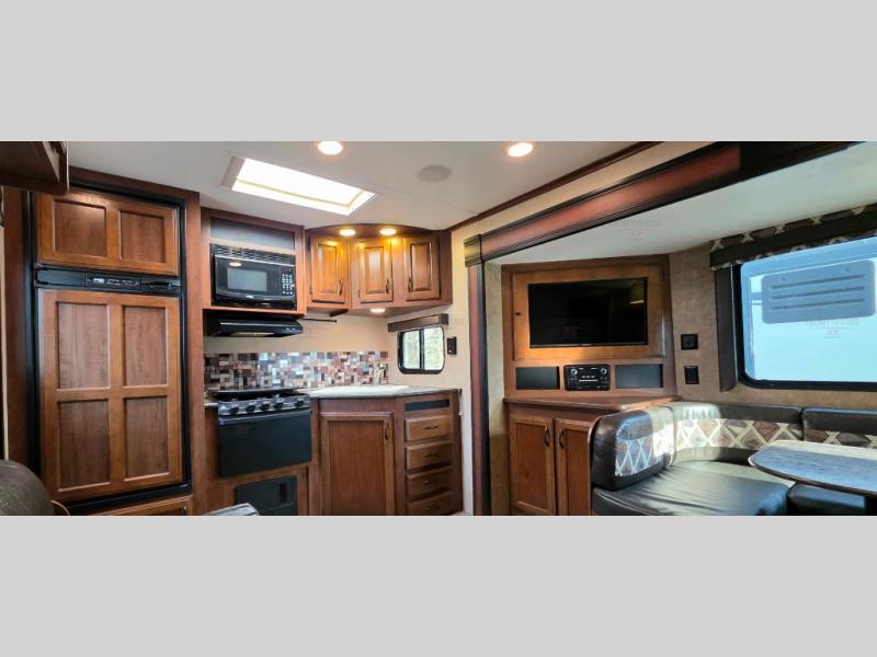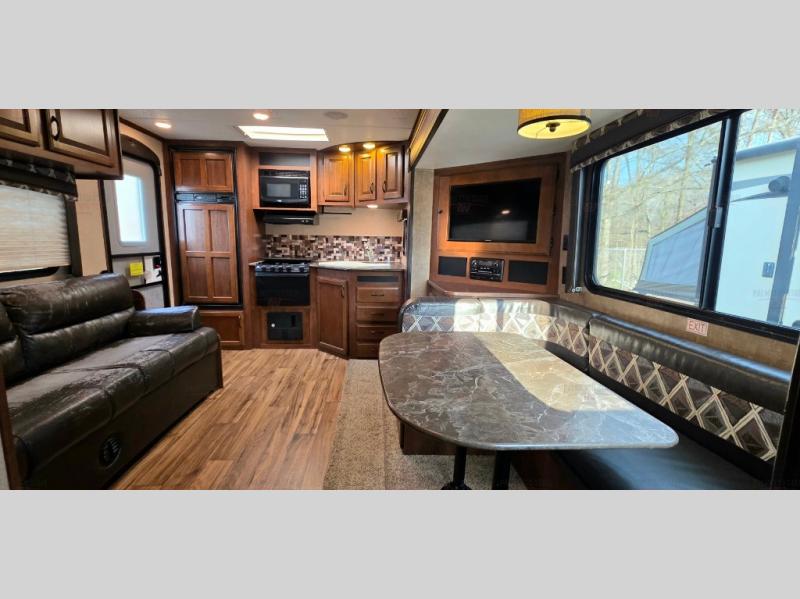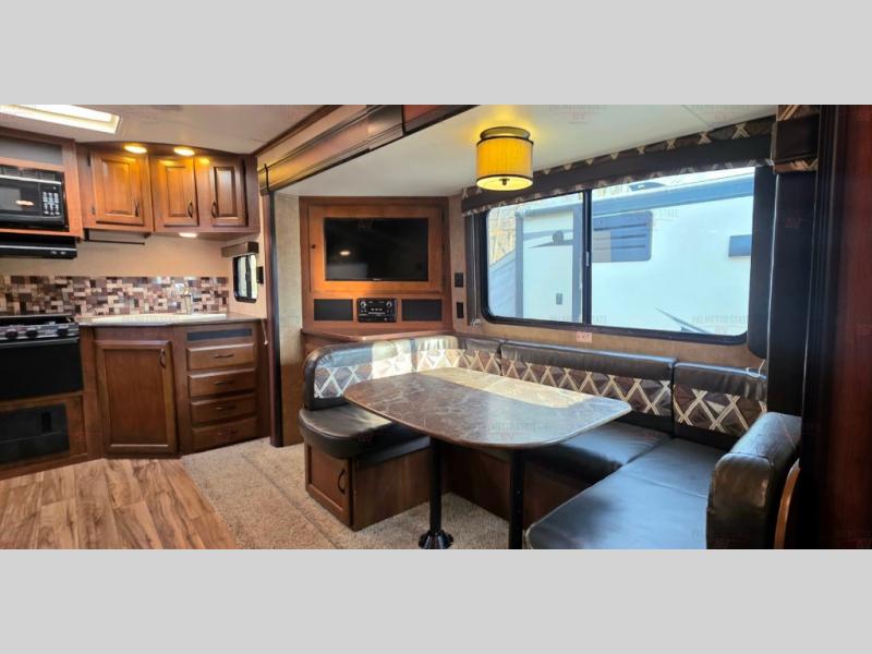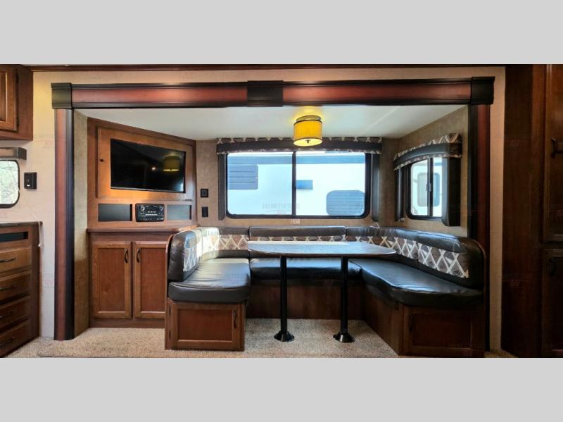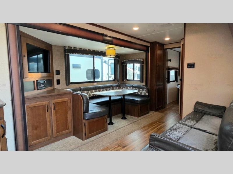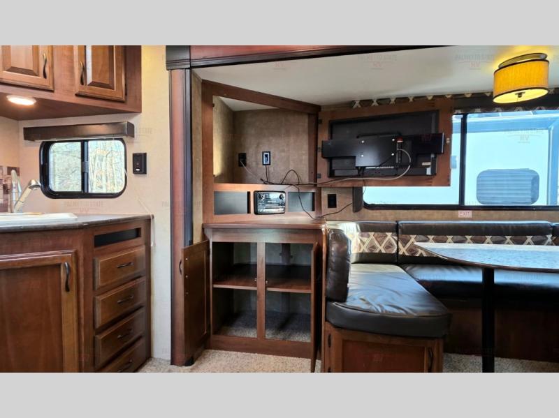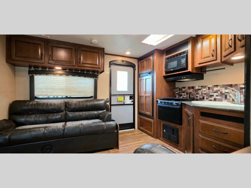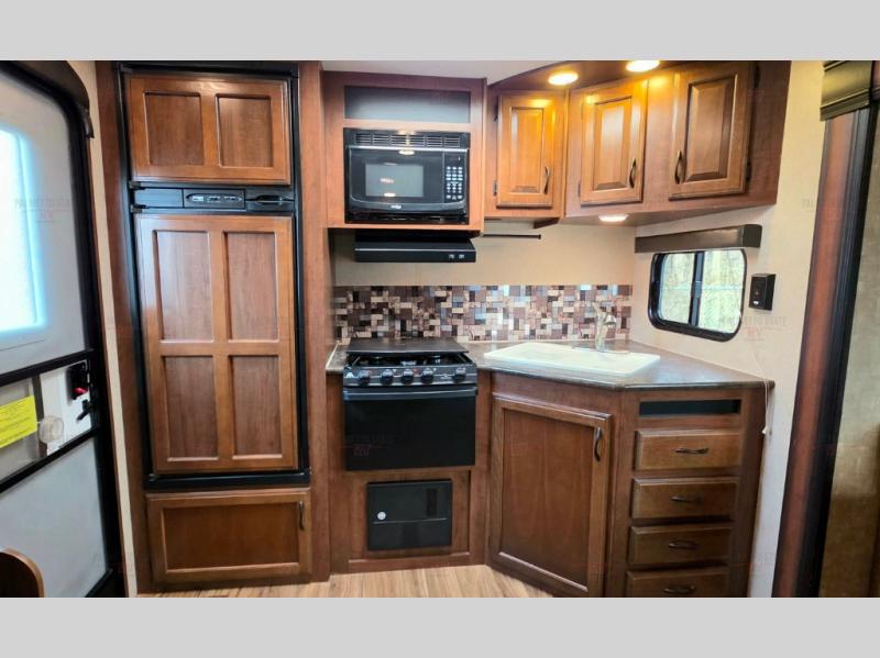 As you enter the rear entrance of the travel trailer you will find that there is a rear kitchen. Along the rear wall there is a refrigerator, three burner range, microwave, and double kitchen sink. The slide has an entertainment center with storage and a u-dinette. Next to the slide you will find a linen cabinet for towels or toiletries. On the opposite side of the trailer there is a sofa.
