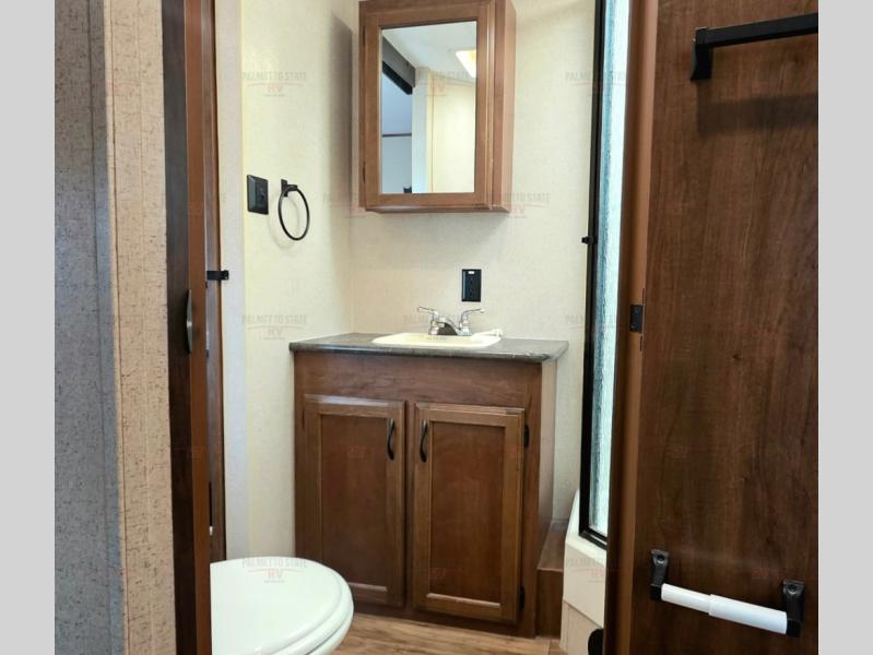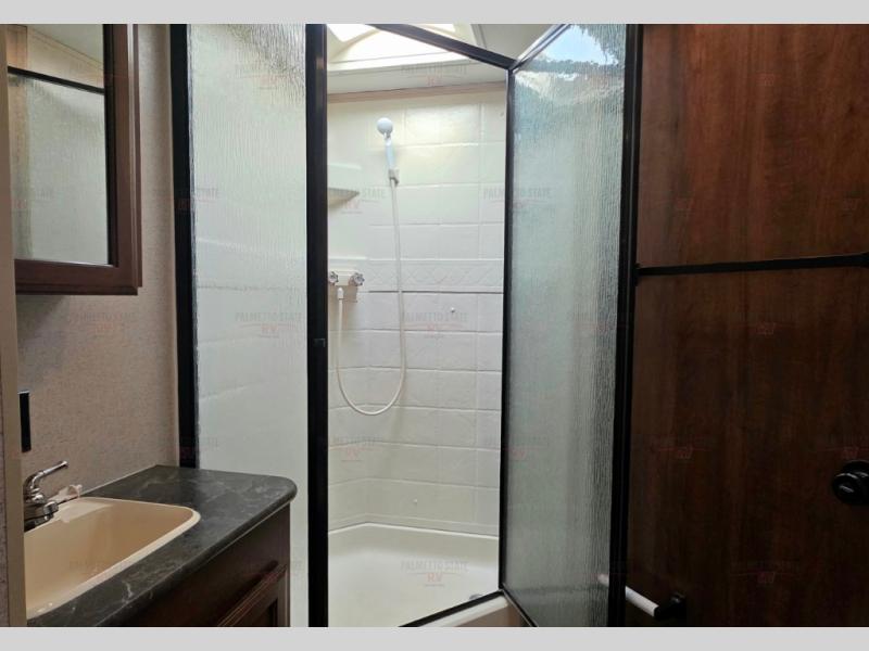 In the bathroom there is a shower, toilet, and sink. The bathroom has two entry doors, one leads into the front bedroom, and the other entry door takes you back into the main living are of the trailer.