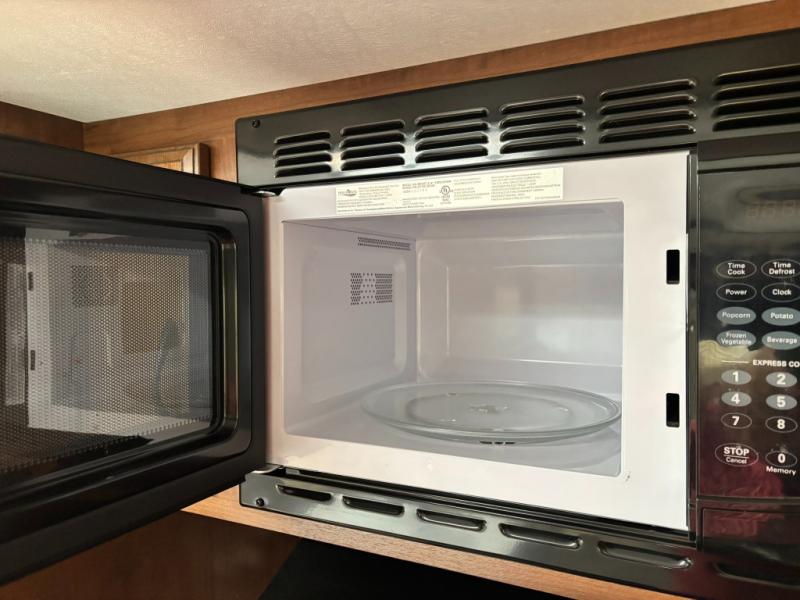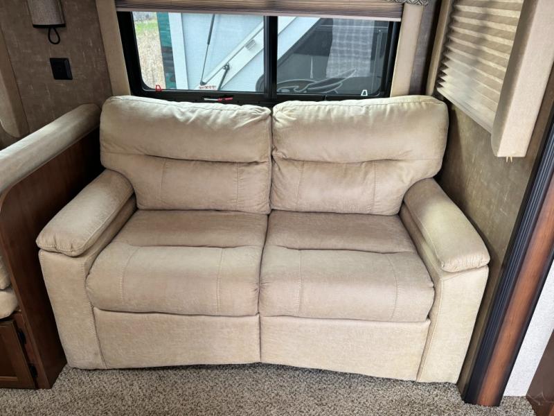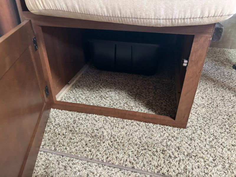 In the kitchen and main living area there are two slides. One slide has a refrigerator, three burner range, and microwave. Next to the slide there is a large pantry for your food items. The other slide has a dinette or optional free-standing table and chairs and a sofa or an optional hide-a-bed. The entertainment center can easily be viewed while working in the kitchen. The kitchen island has extra counter space for food prep and also a double kitchen sink.