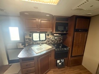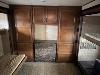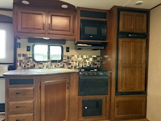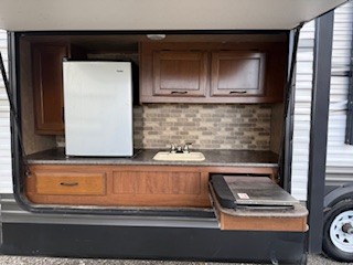 You will find plenty of overhead cabinets throughout the travel trailer as well as exterior storage. Outside there is even an outside kitchen which features a refrigerator, sink, overhead cabinet, and two burner range, and much more!