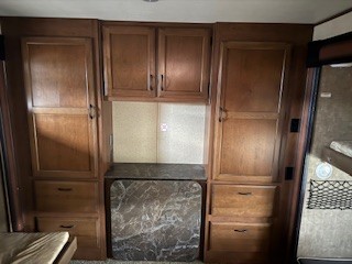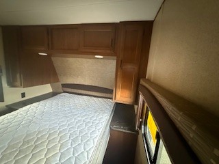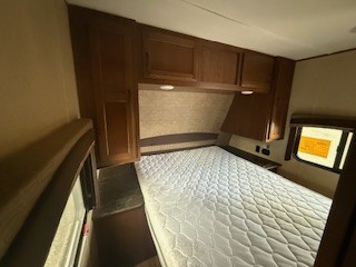 Stepping inside the travel trailer, to the right is a comfortable queen bed, two wardrobes, one on either side of the bed, and an overhead cabinet above the bed.