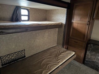The bunk house offers two sets of slides, one slide has a sofa on the bottom and a top bunk above the sofa. On the opposite side of the room the slide has a set of bunk beds, and along the rear wall there are two wardrobes, an entertainment center, and a flip-up table.