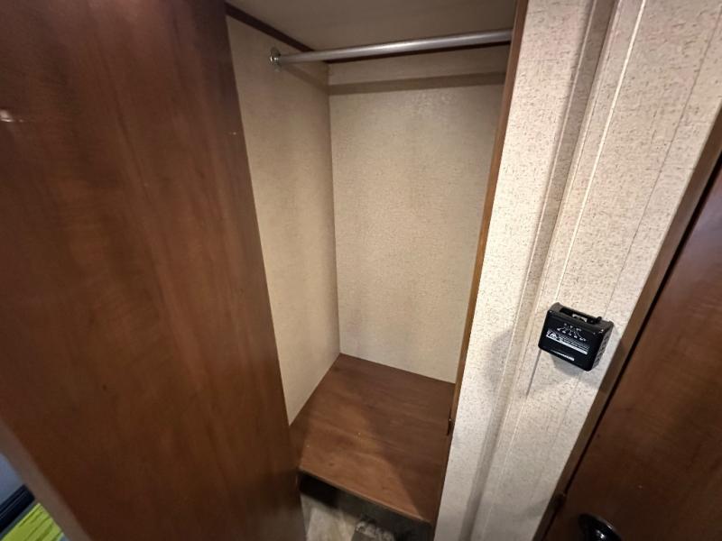 As you enter the travel trailer, to the left is a wardrobe. Continuing in the rear you will find the bathroom with a toilet, tub/shower.