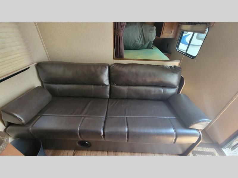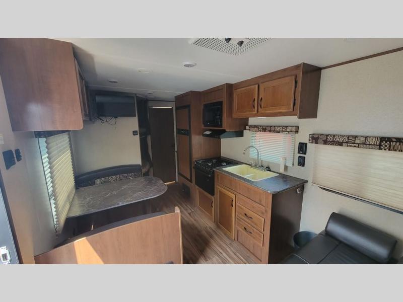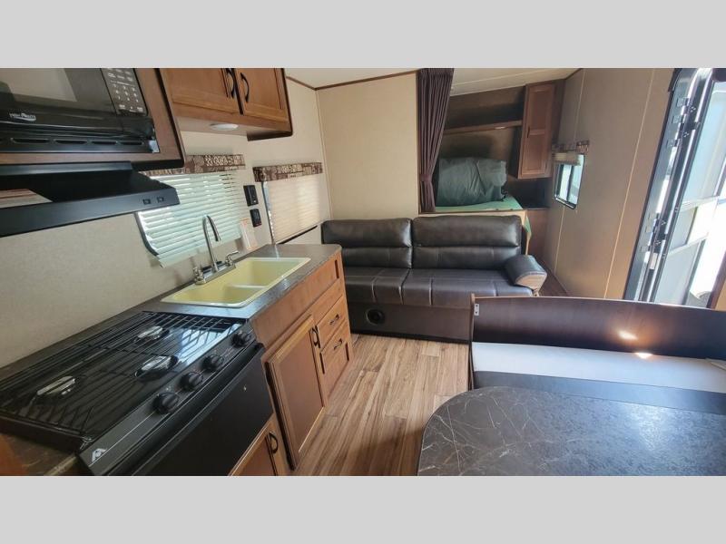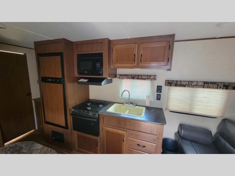 As you enter the travel trailer, to the left there is a dinette. Across from the dinette you will see a refrigerator, three burner range, microwave, and double kitchen sink. There is also a nice sofa in the main living area.