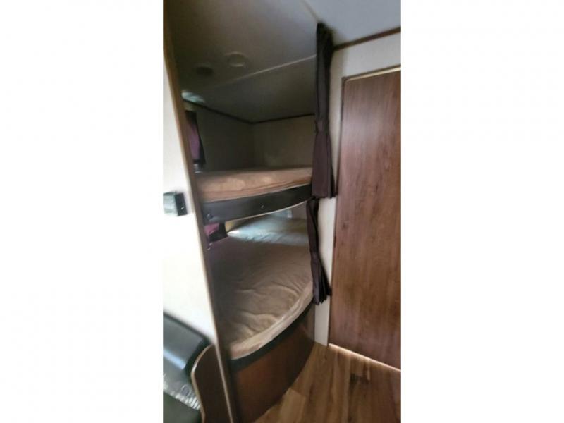 As you proceed toward the rear of the trailer, you will find a set of double bunk beds in the left corner of the travel trailer. With the double bunks you can sleep four people in this area!