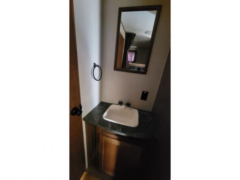 The bathroom is located in the right rear corner of the trailer. In the bathroom there is a tub/shower and toilet. Just outside of the bathroom area there is a sink.