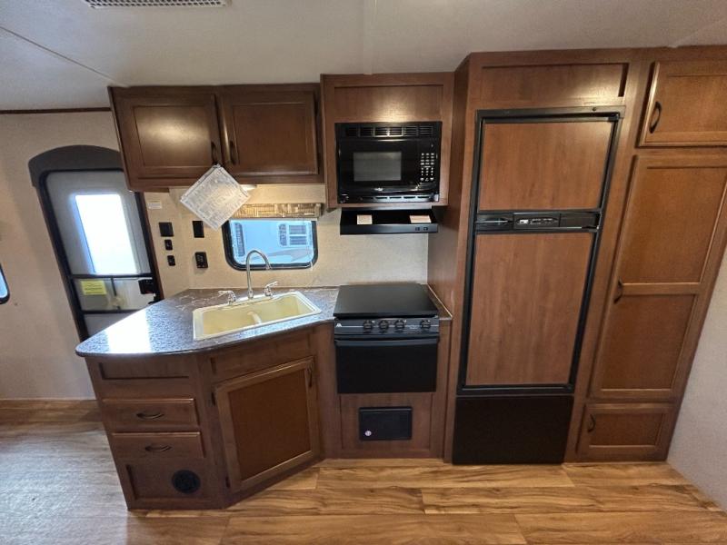 Stepping inside the travel trailer, to the left you will find a double kitchen sink, three burner range, microwave, refrigerator and large pantry. You will also notice how open and spacious the kitchen and living area are since there is a slide. The opposite side of the trailer features a slide with a dinette, sofa, and overhead cabinet above the sofa. Along the front of the living area you will see a large entertainment center.