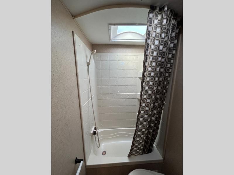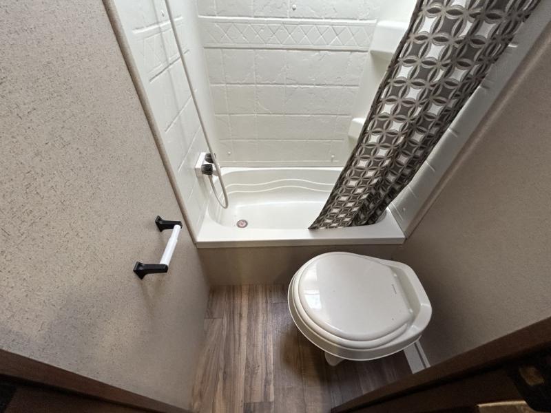 As you proceed toward the rear of the trailer you will come to the rear bathroom in the right corner. Inside the bathroom there is a toilet, tub/shower. Just outside of the bathroom is the sink.