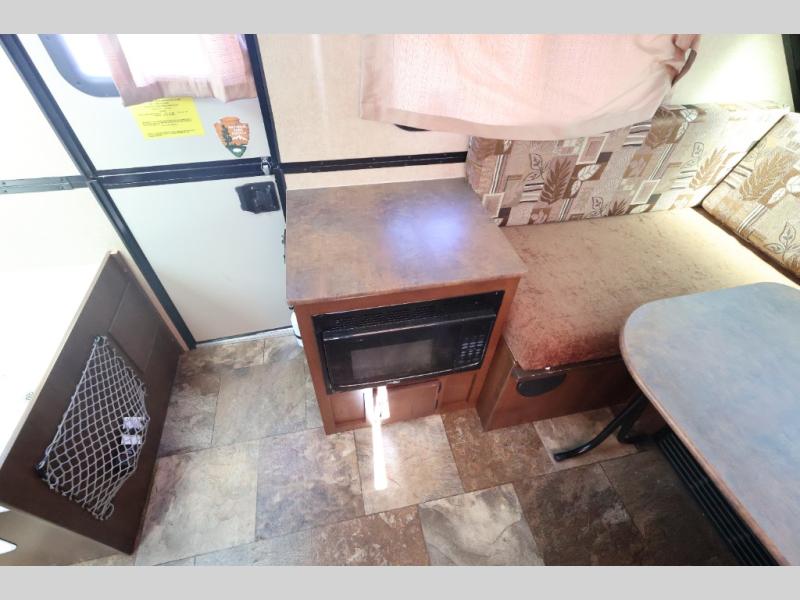 Inside the camper, to the left there is a microwave cabinet. On the opposite side there is a sink, three burner range, storage cabinet, and refrigerator. Along the rear of the camper you will find a u-dinette.