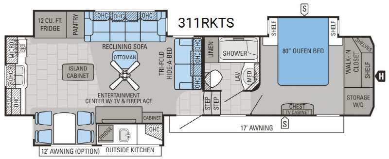 The kitchen is found in the rear of this unit and features a spacious layout as well. Along the rear wall find counter space with a center double sink, and a three burner range with overhead microwave. A center island cabinet provides added food prep or serving space. Adjacent in the second slide you have a 12 cu. ft. refrigerator, food pantry, plus a reclining sofa on the opposite end. The sofa features overhead cabinetry, and an ottoman. Along the interior wall there is additional seating with a tri-fold hide-a-bed including more storage above.