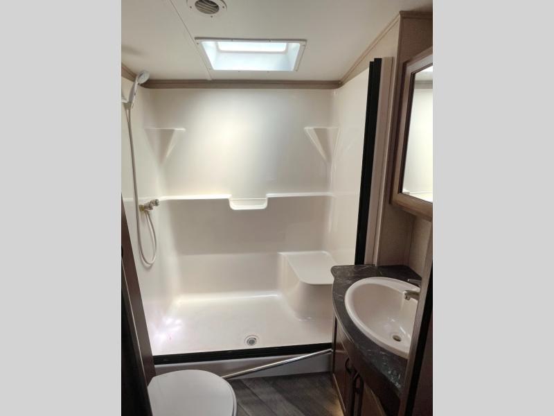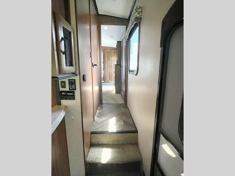The door at the end of the hall features a queen size slide out bed, or optional king. There are chests on both sides of the bed. If you choose the king option the chests will become a storage shelf. A convenient walk-in closet is in front with shelving and space for hanging your clothes. Another chest is located along the curb side wall and features an overhead TV cabinet. In the front corner another storage space has been prepped for a washer and dryer which makes it easy to stay out on the road for awhile.