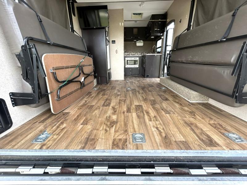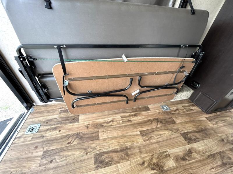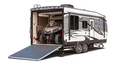 This lightweight toy hauler makes it easy to bring your gear with a 7 foot ramp door that includes spring assist for smooth loading. Once you arrive, the rear cargo area converts quickly into a living and sleeping space with two fold away sofas and the optional power queen bed.