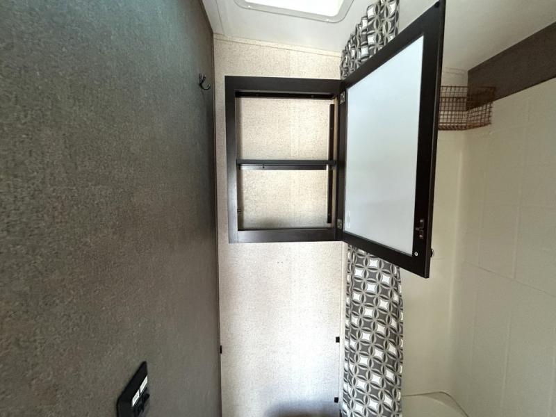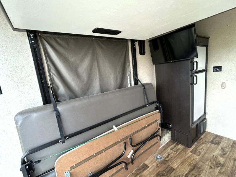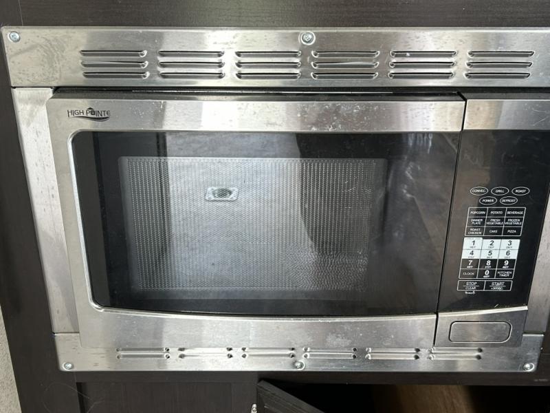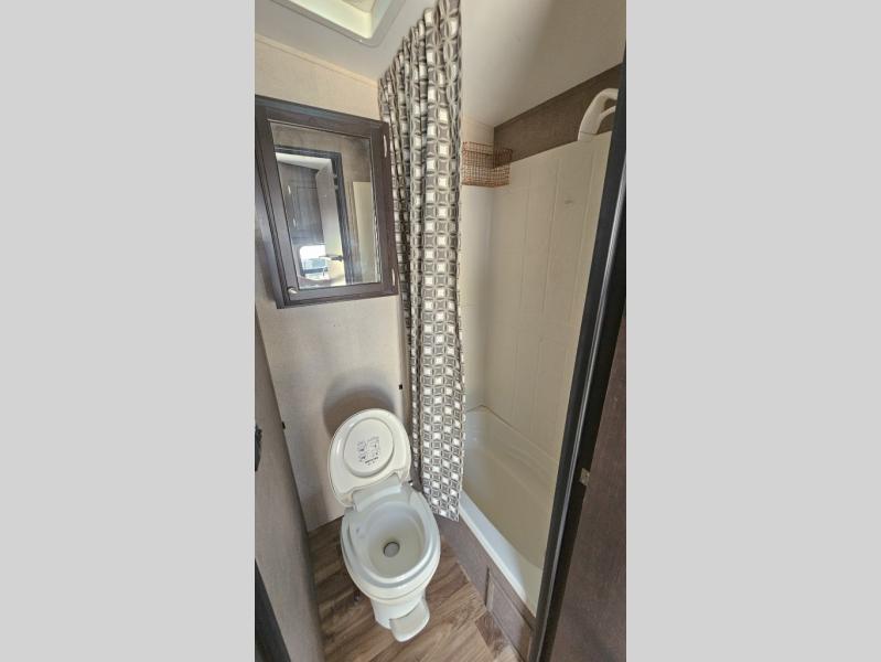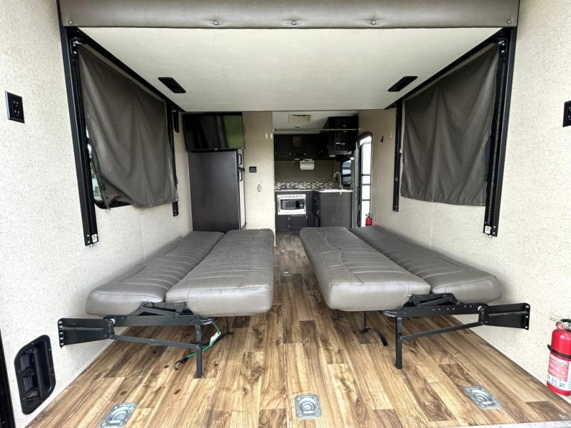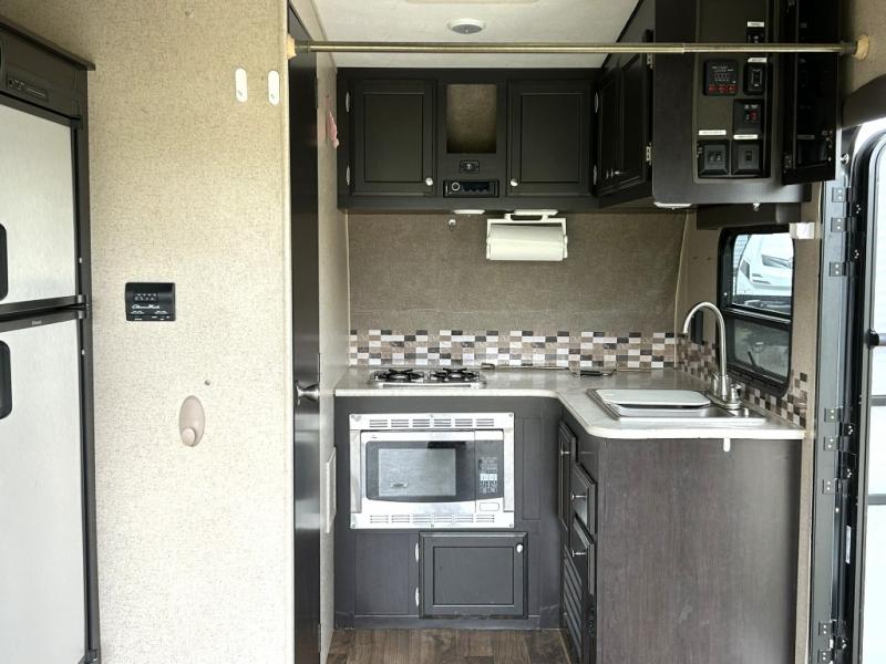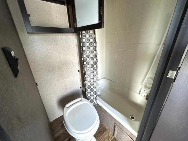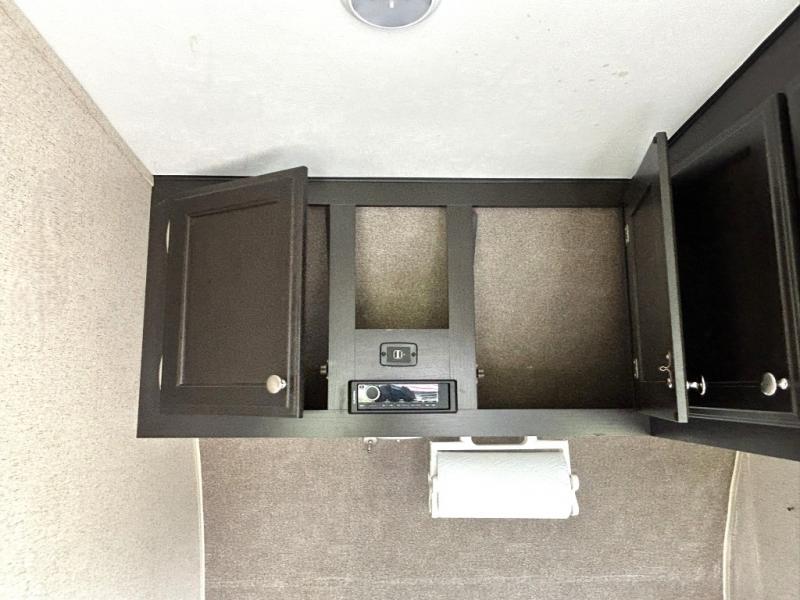 Enjoy cooking at camp with a two burner cooktop, microwave, refrigerator, and double sink. The kitchen also includes overhead storage and a front TV mount location. The private bathroom includes a tub and shower combo, toilet, and a mirrored medicine cabinet.