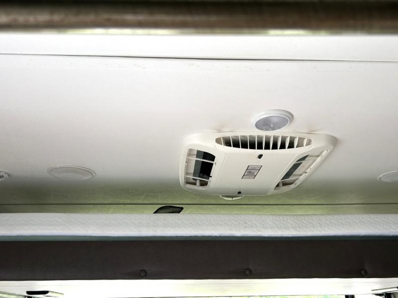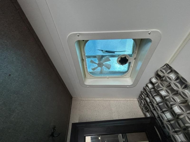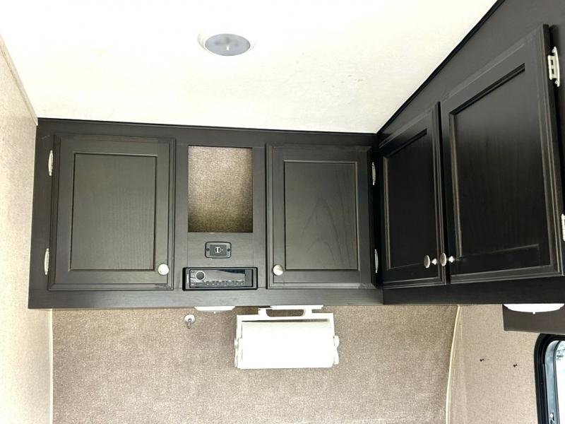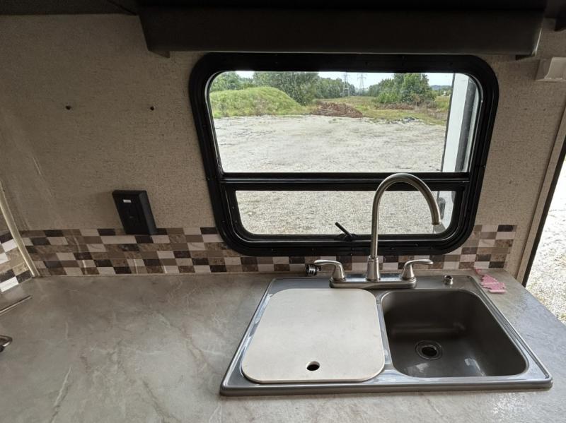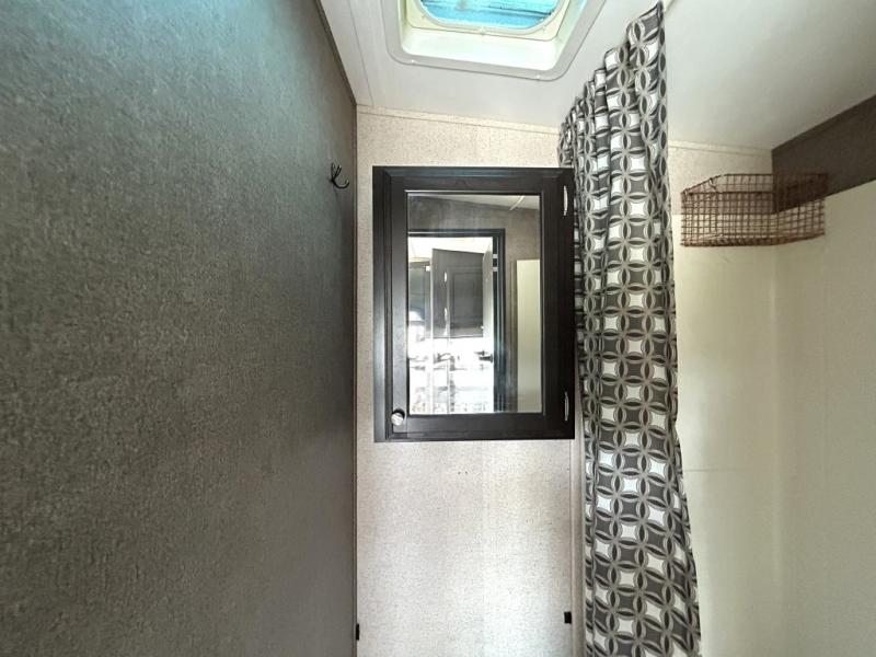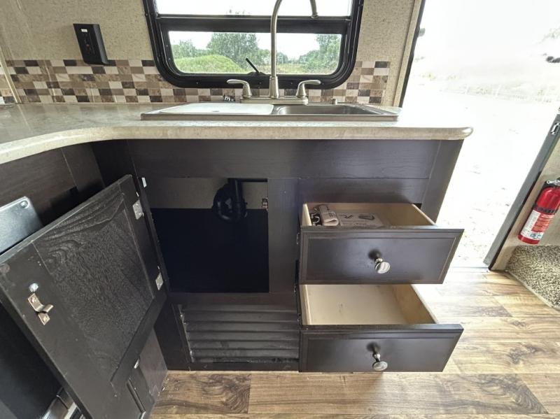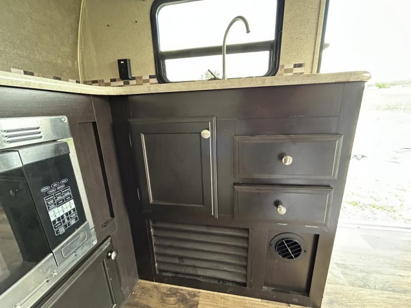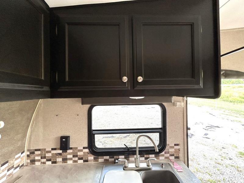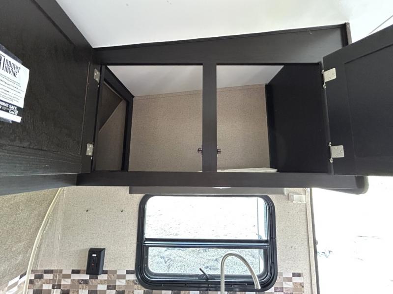 Enjoy cooking at camp with a two burner cooktop, microwave, refrigerator, and double sink. The kitchen also includes overhead storage and a front TV mount location. The private bathroom includes a tub and shower combo, toilet, and a mirrored medicine cabinet.