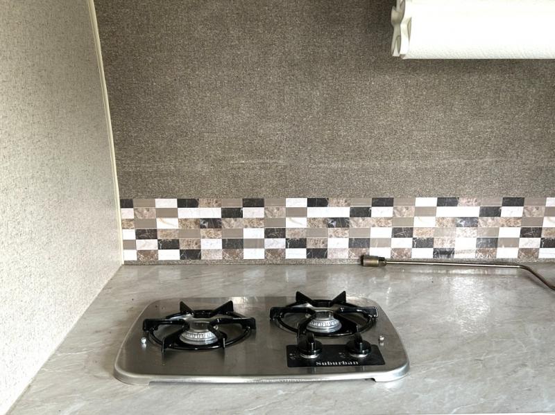 Front Kitchen with Two Burner Range and Microwave