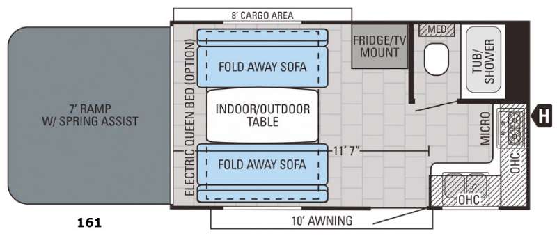 The 161 model offers optional layouts including a fold away dinette or freestanding table and two lounge chairs. Whether you are camping with friends or bringing the family, the flexible interior adjusts to your needs.
