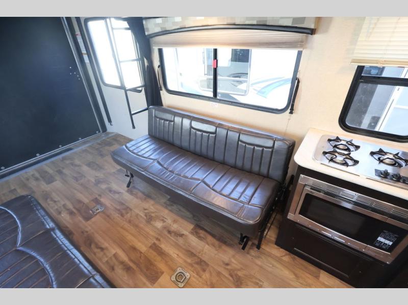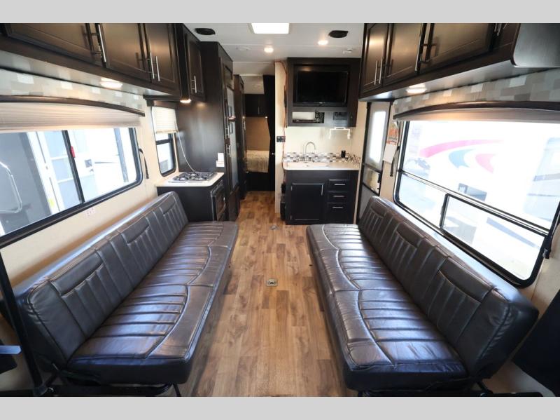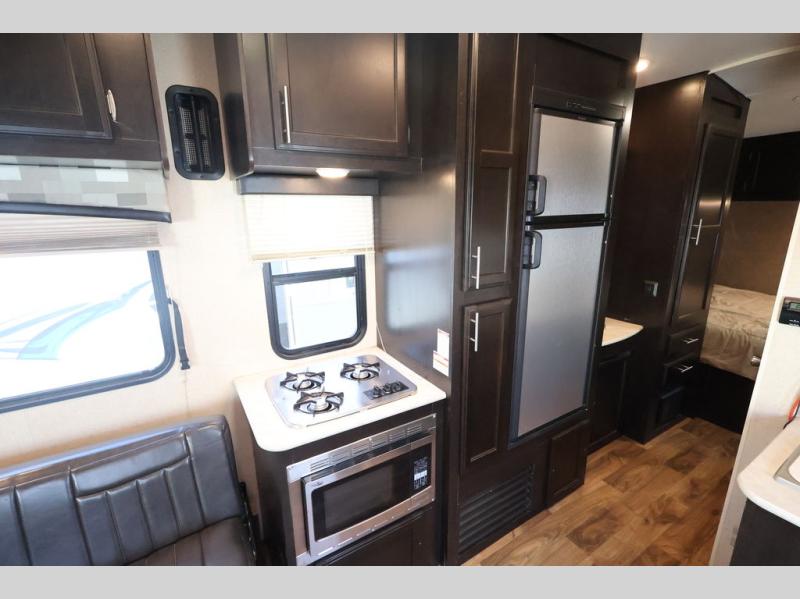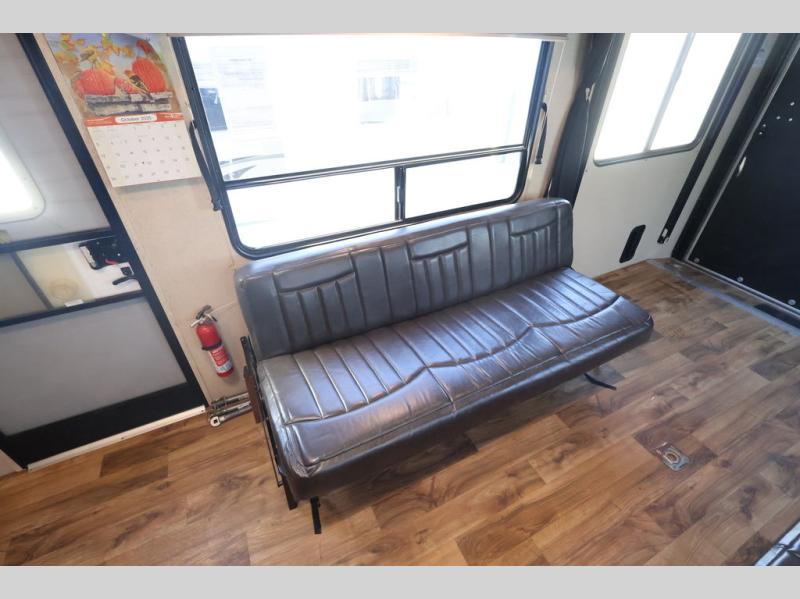 With a 7'-8" spring assist rear ramp, it is not a problem to load and unload your off-road toys on the T26Y Octane toy hauler travel trailer by Jayco. In the rear you have plenty of sleeping space with a dual electric queen bed, a fold-away sofa, and a fold-away dinette.