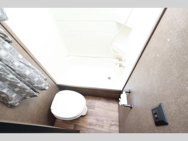 Along one side of the trailer there is a toilet and tub/shower. On the opposite side of the trailer you will find sink and medicine cabinet.