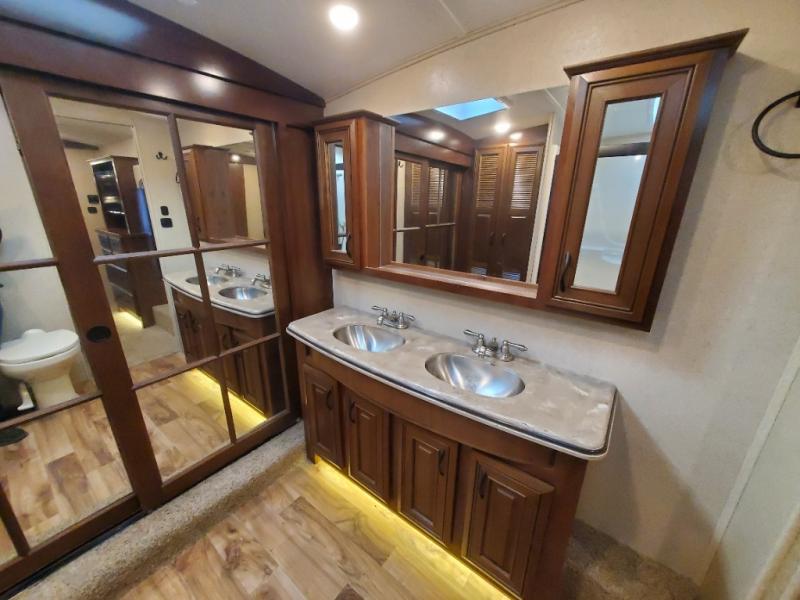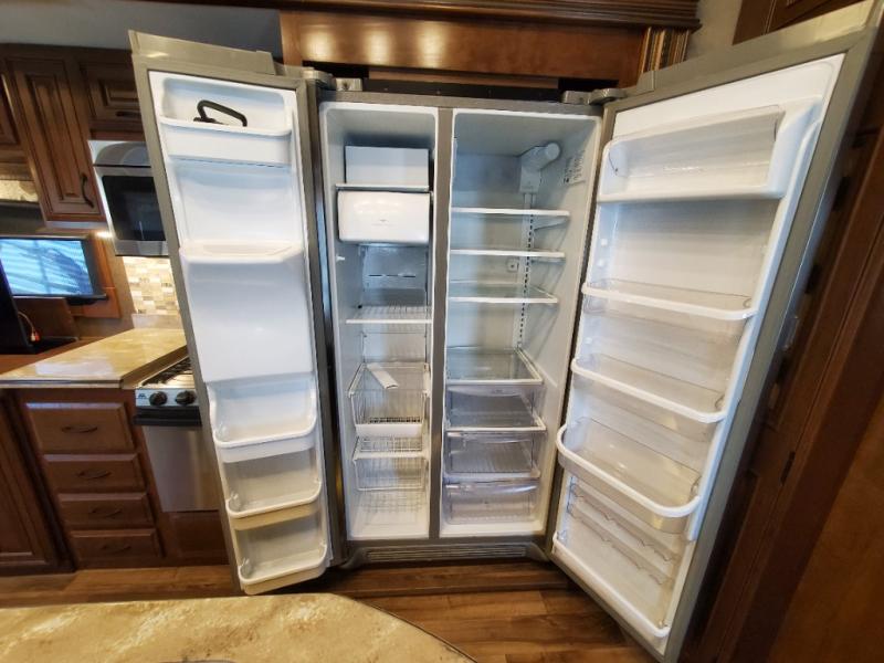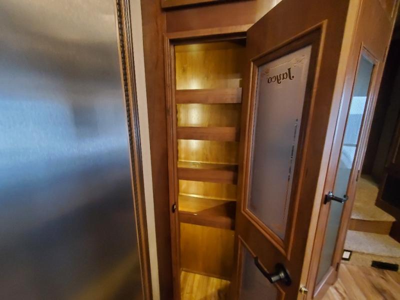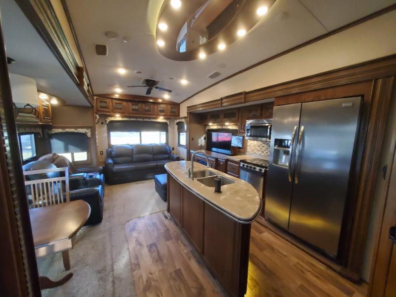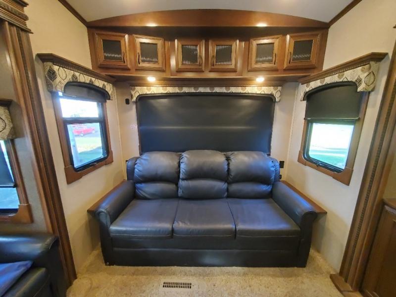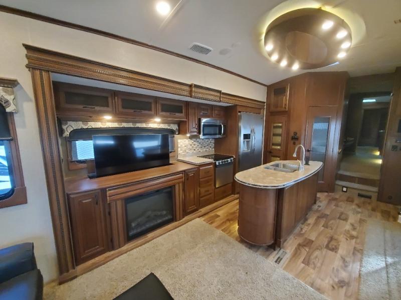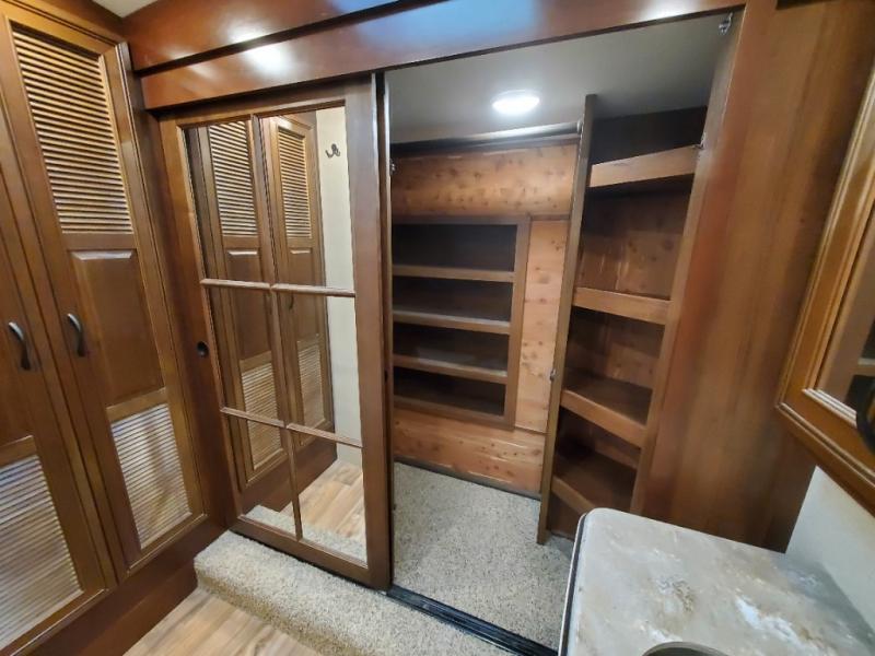 As you enter the fifth wheel, to the left there is a slide with a free-standing table and chairs which can comfortably seat four people, and theater seats with an ottoman and overhead cabinets or choose two recliners instead. There is a ceiling fan in this fifth wheel. Along the rear wall there is a tri-fold hide-a-bed sofa or choose the reclining sofa instead. The other slide out offers a TV with lift and fireplace below, three burner range, microwave, and 23 cu. ft. refrigerator or choose a 12 cu. ft. refrigerator. There is an optional carpet line in the living space. Next to the slide you will find a large pantry. The kitchen island has a double kitchen sink and extra counter space.