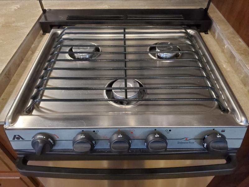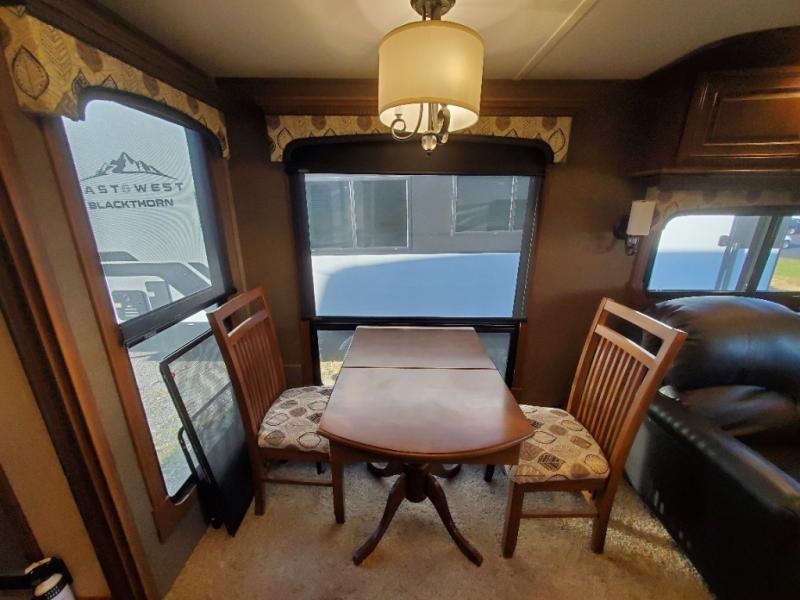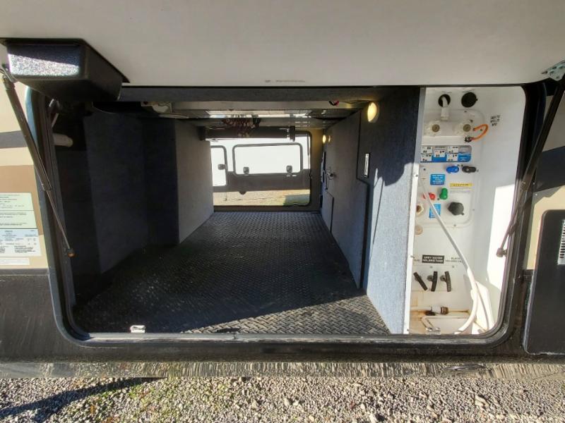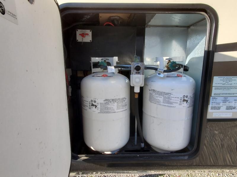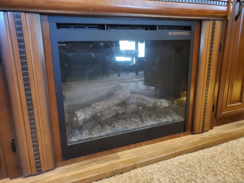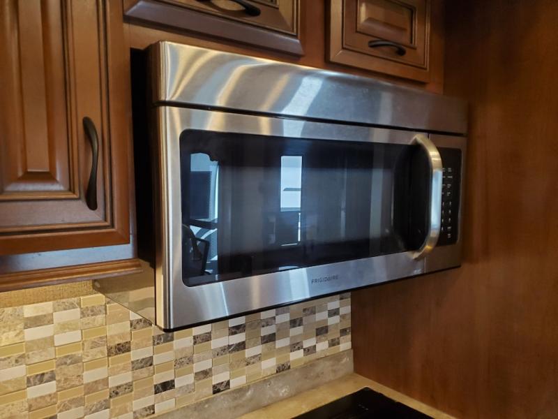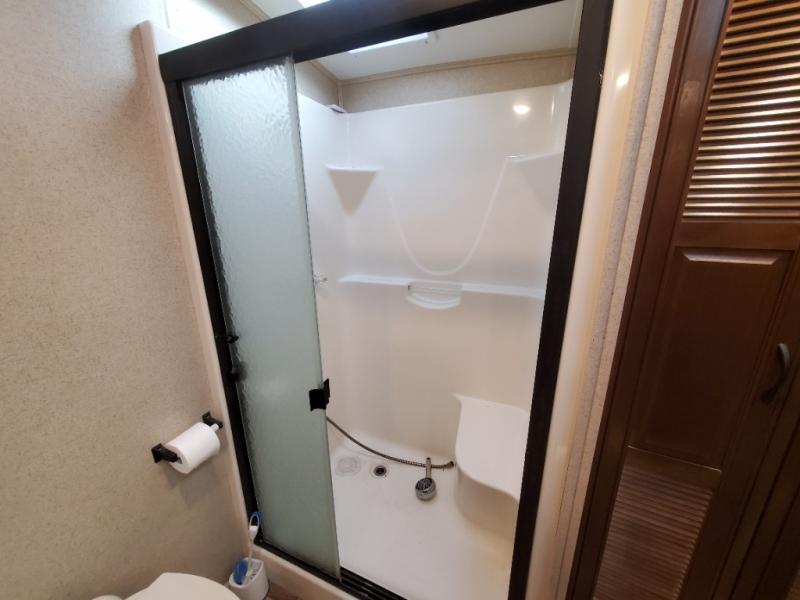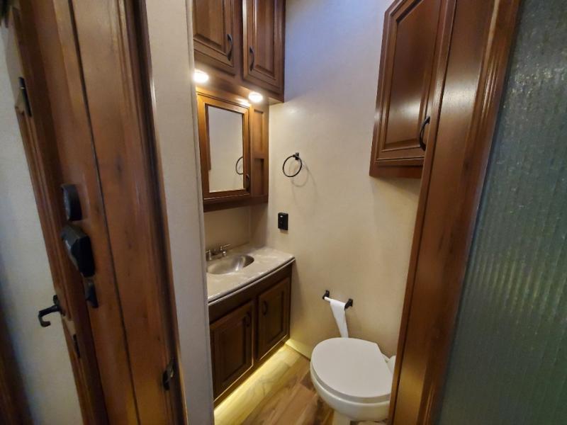 As you enter the fifth wheel, to the left there is a slide with a free-standing table and chairs which can comfortably seat four people, and theater seats with an ottoman and overhead cabinets or choose two recliners instead. There is a ceiling fan in this fifth wheel. Along the rear wall there is a tri-fold hide-a-bed sofa or choose the reclining sofa instead. The other slide out offers a TV with lift and fireplace below, three burner range, microwave, and 23 cu. ft. refrigerator or choose a 12 cu. ft. refrigerator. There is an optional carpet line in the living space. Next to the slide you will find a large pantry. The kitchen island has a double kitchen sink and extra counter space.