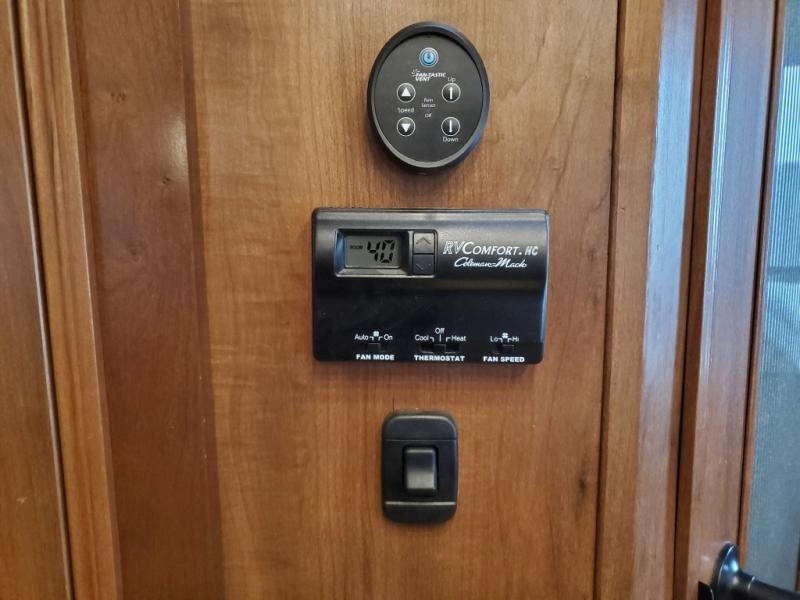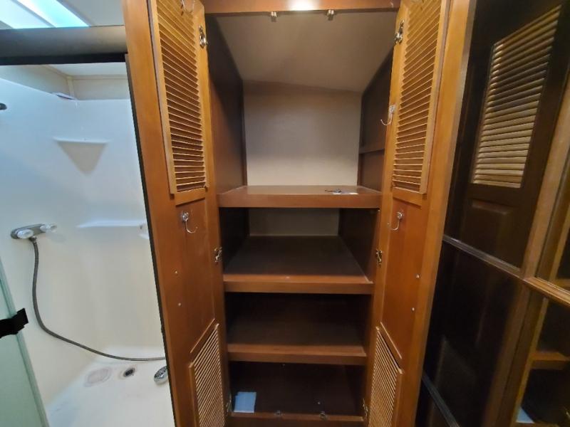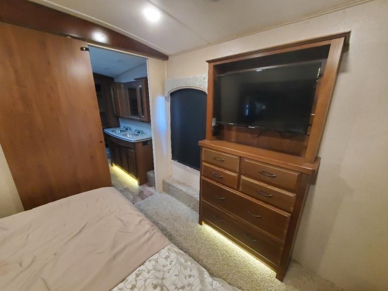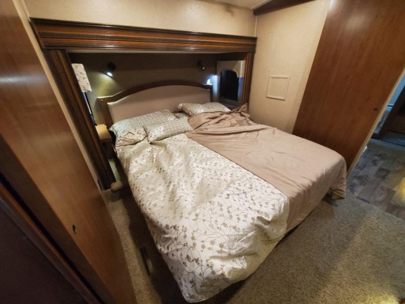 Stepping up the stairs, you will enter into the bedroom. Along one wall you will find a king bed slide with shelves, or choose a queen bed with chests. On the opposite side of the bedroom there is a chest with a 32" LED TV with DVD.