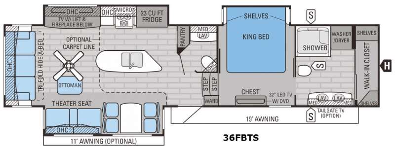 Outside you can enjoy the 19' awning, optional 11' awning, optional tailgate TV, plus the exterior storage, and so much more!