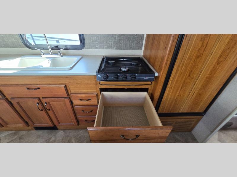 As you enter the motor home, to the left is a nice counter area, double kitchen sink, three burner range, microwave, and refrigerator. The slide has a sofa with an overhead cabinet above the sofa, and a u-dinette.