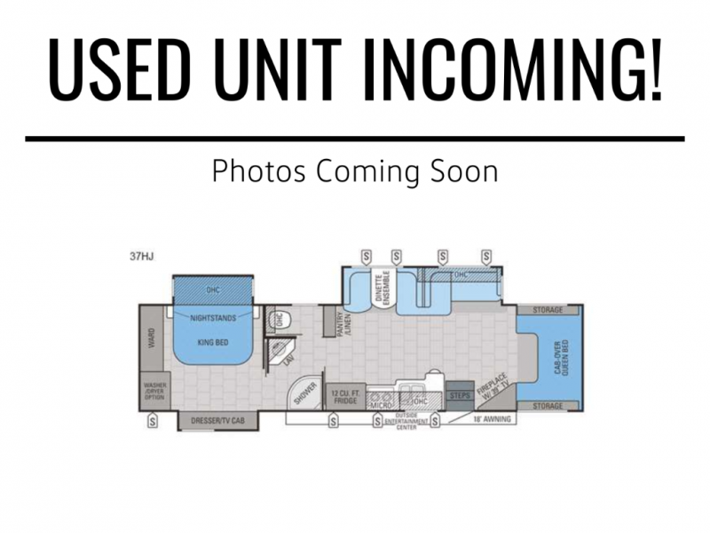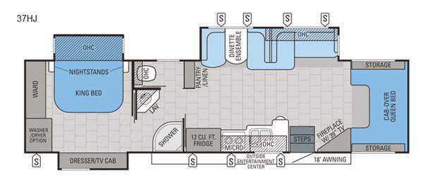 To the right of the entrance there is a corner fireplace with 39" TV. Above the cab you will find a queen bed with storage on either end of the bed, or you can choose an optional entertainment center above the cab.