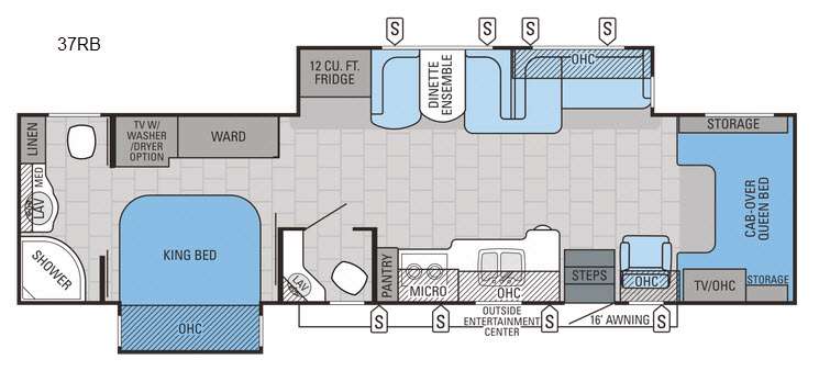 There are plenty of overhead cabinets throughout the motor home as well as exterior storage compartments, 16' awning, and an outside entertainment center, plus more!