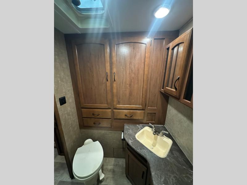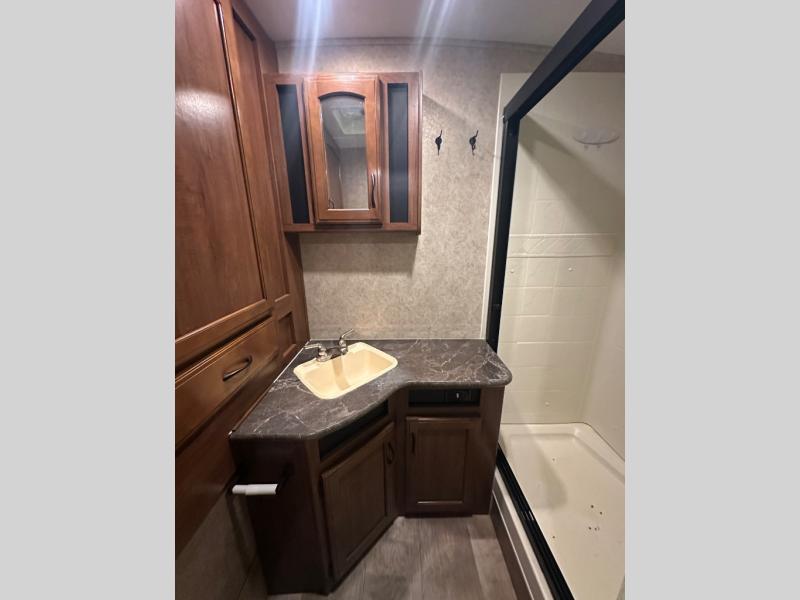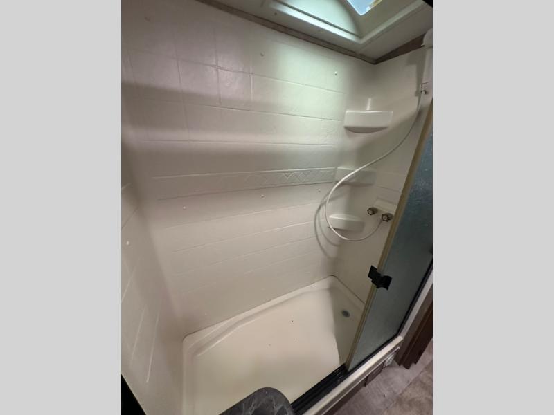 In the rear of the travel trailer, you will find the bathroom. There is a shower, wardrobe, sink, medicine cabinet, and a toilet.