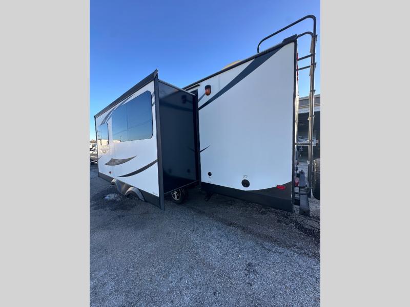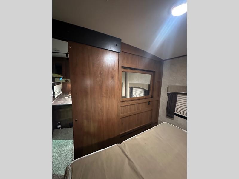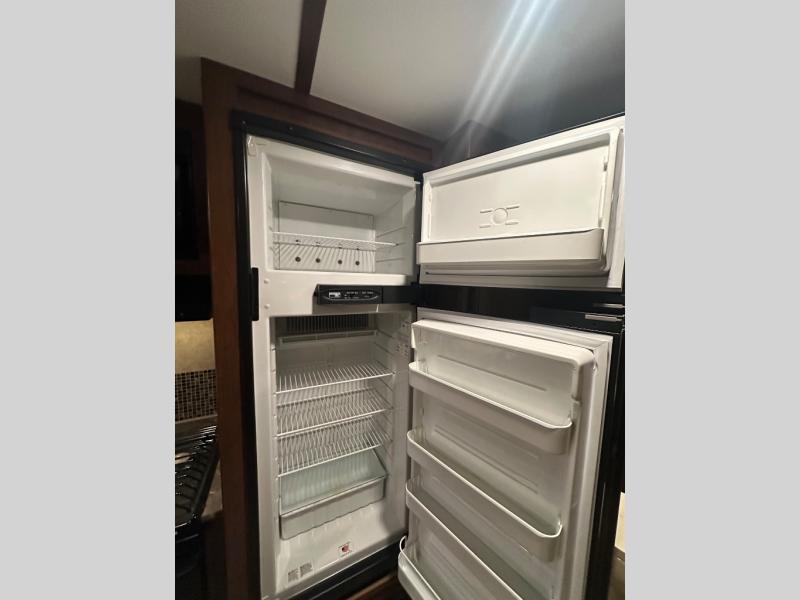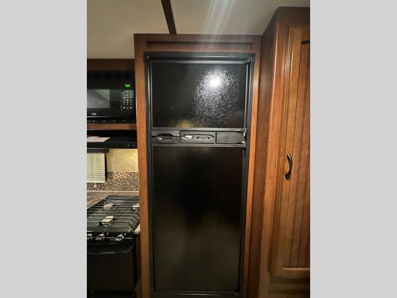 There are plenty of overhead cabinets throughout the trailer as well as outside storage. You are also sure to enjoy the outdoor kitchen which has a refrigerator, counter space, and a pull-out two burner cook-top.