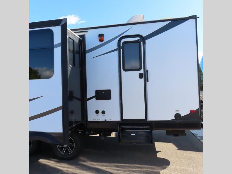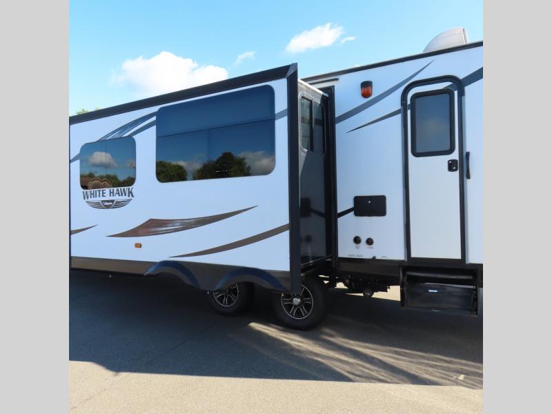 The White Hawk 28BHKS travel trailer by Jayco provides sleeping space for up to eight people as well as an exterior kitchen, two entrances, and a kitchen island.