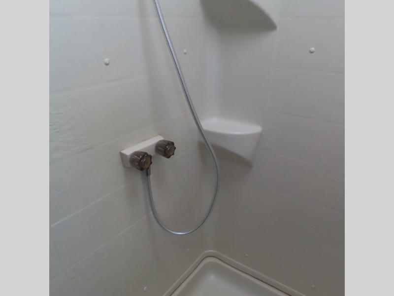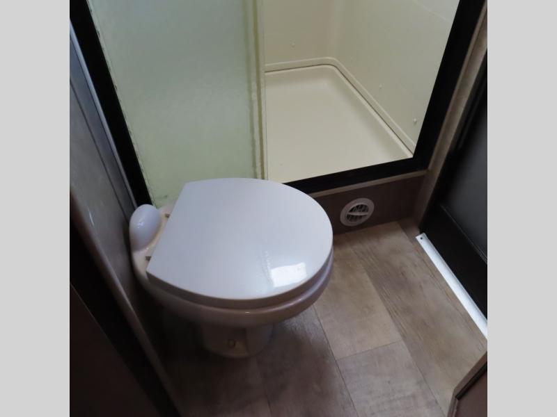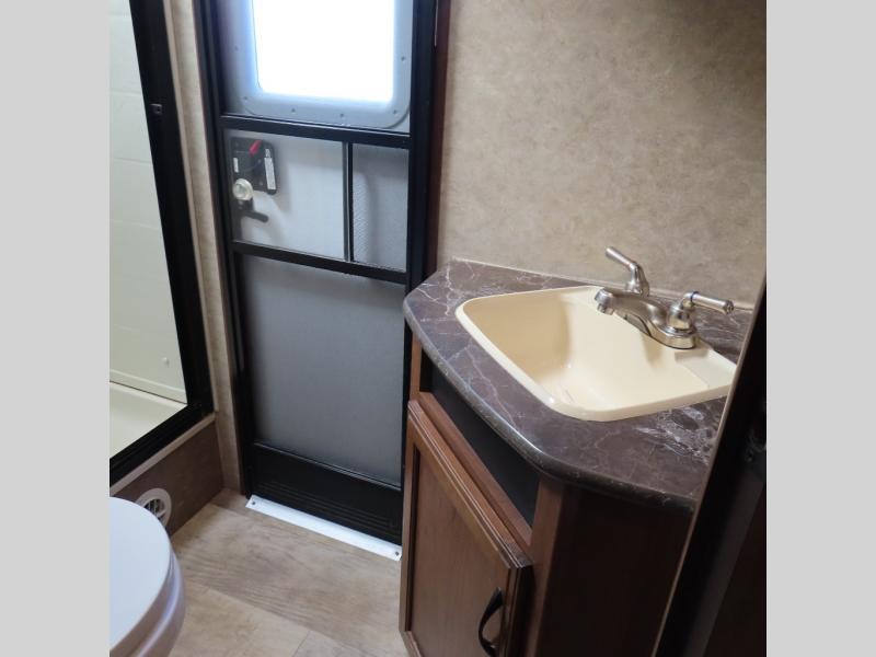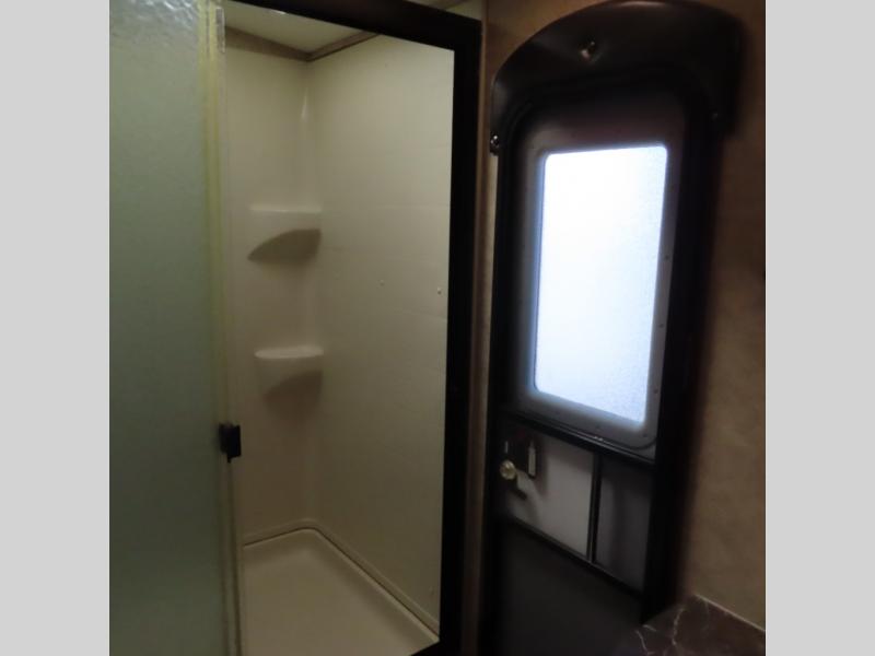 Located in the rear of the trailer you will find the bathroom. Inside the bathroom there is a toilet, shower, sink, medicine cabinet, and private entrance door which leads outside.