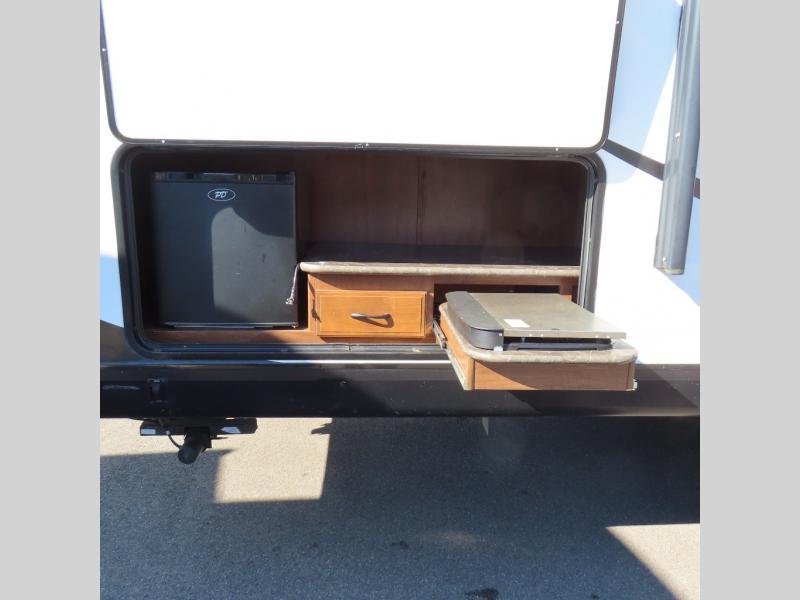 Outside there is an outdoor kitchen with a refrigerator, counter space, and a pull-out two burner cook-top, plus the optional Chil N' Stor exterior refrigerator on the other end of the trailer. The 18' awning provides shade from the sun, and the exterior storage provides space for all of your extra gear, plus so much more inside and out!