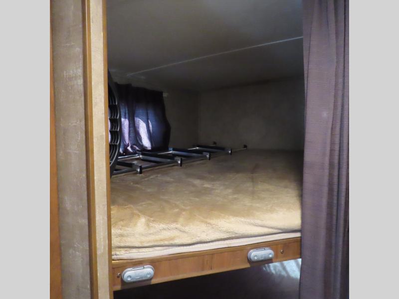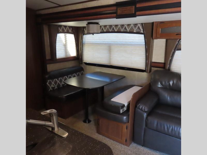 The road side slide out features a hide-a-bed with overhead cabinets, and a booth dinette or you can choose an optional free-standing table and chairs instead.