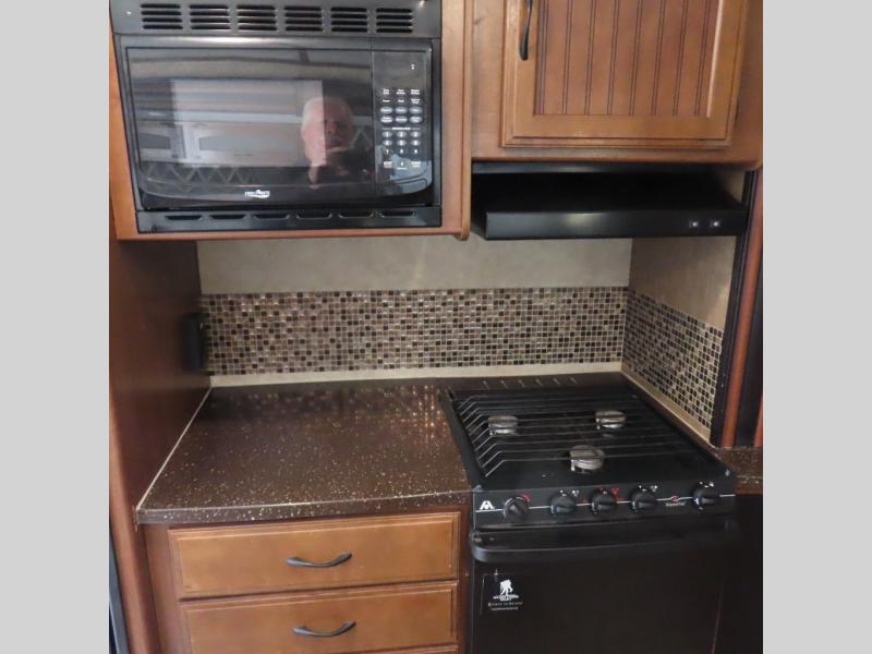 On the opposite side, the kitchen area has a refrigerator, three burner range, and microwave slide. Next to the slide there is a large pantry for your dry goods, and a linen cabinet for towels or toiletries. In the middle of the kitchen you will find an island with a kitchen sink and extra counter space for food prep.
