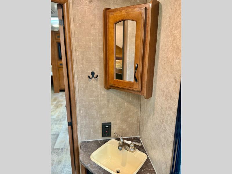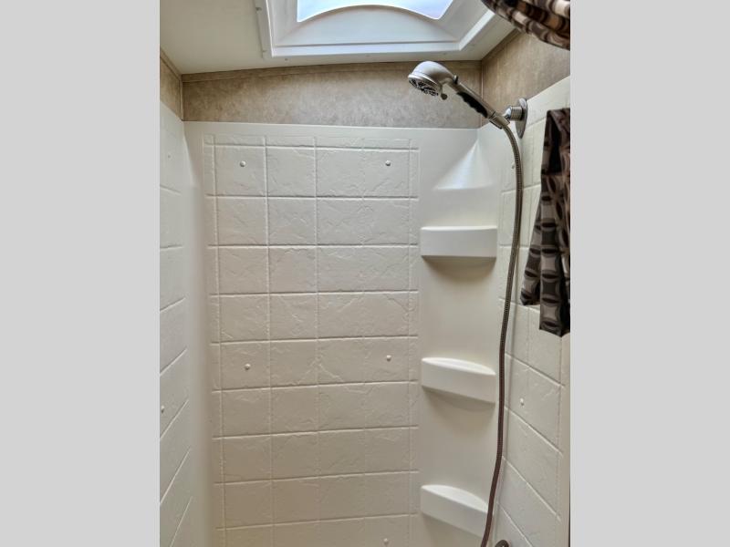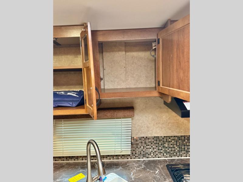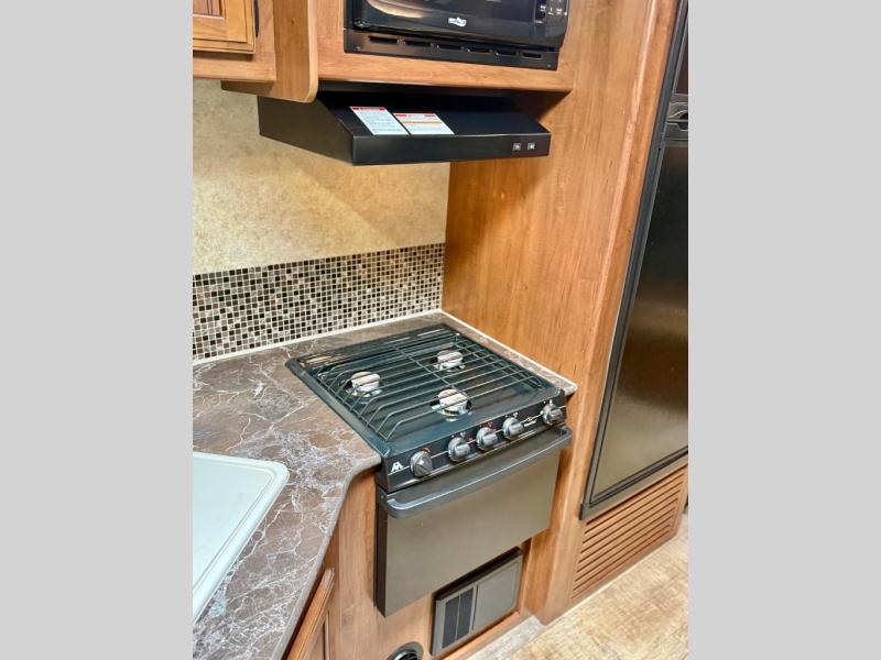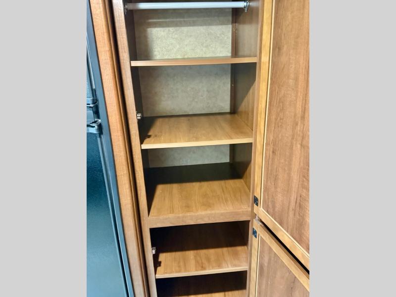 The main living area has a slide with a hide-a-bed sofa and a booth dinette. On the interior center wall is a entertainment center for your enjoyment. You will also find an angled kitchen sink and countertop, three burner range, microwave, refrigerator, and a pantry/wardrobe on the opposite wall from the slide out. An additional pantry is next to the dinette.