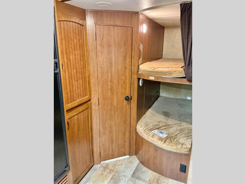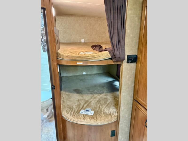 In the rear back right corner is a set of double size bunk beds with a privacy curtain for more sleeping room for friends and family.