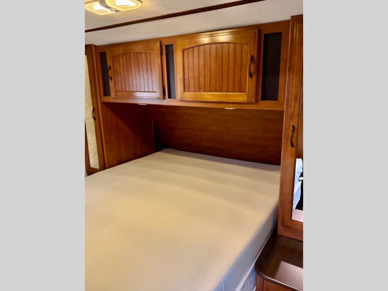 As you enter the main entrance, the bedroom is to the right. Inside the bedroom you will find a comfortable queen bed with overhead cabinets and two wardrobes, one on either side of the bed. You can slide the doors closed for privacy.
