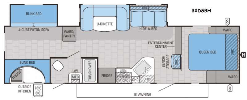 Straight in from entry door notice the bench with storage and overhead cabinet, and the entertainment center on the interior wall. You can easily enjoy the entertainment center from the slide out hide-a-bed sofa or u-shape dinette. Both can provide extra sleeping space at night when needed.