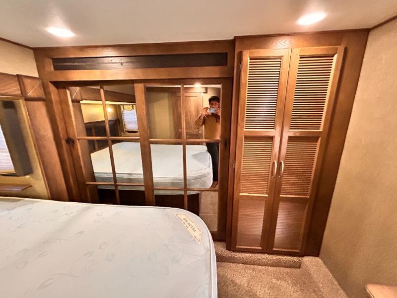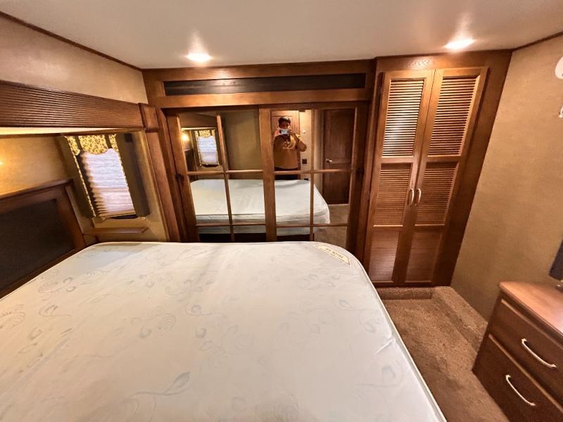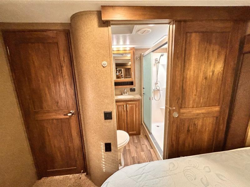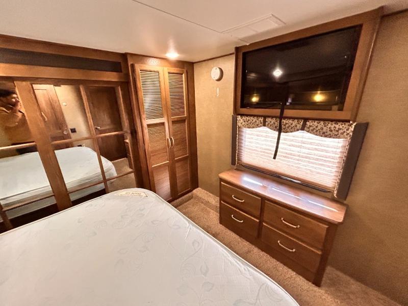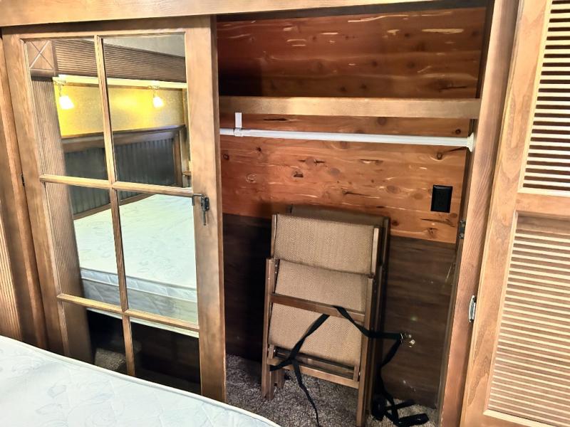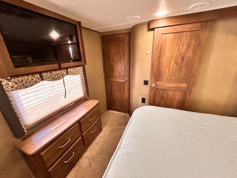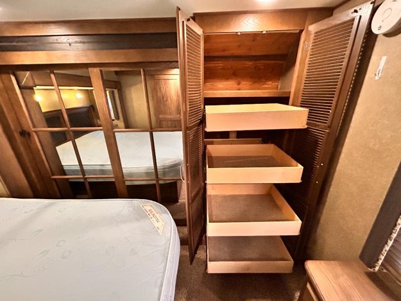 The front private bedroom provides a comfortable place to relax and rest up for the next days adventure. There is a king bed slide, chest of drawers opposite the bed, and front closet with sliding doors. You will also find a washer and dryer closet with drawers, plus so much more!