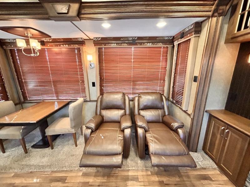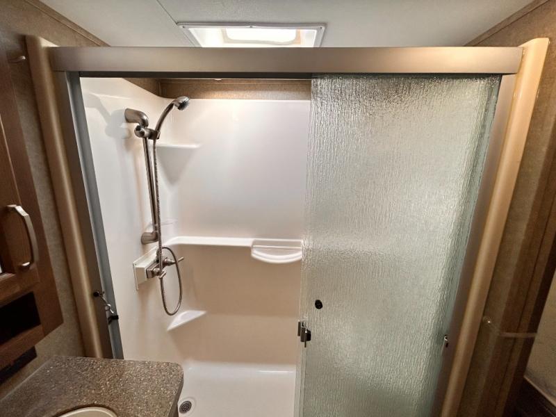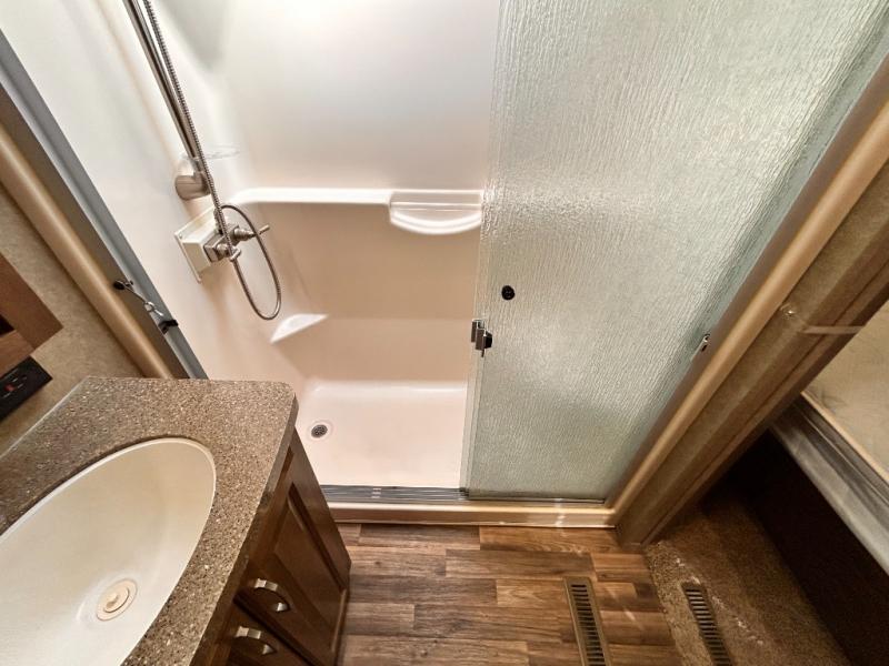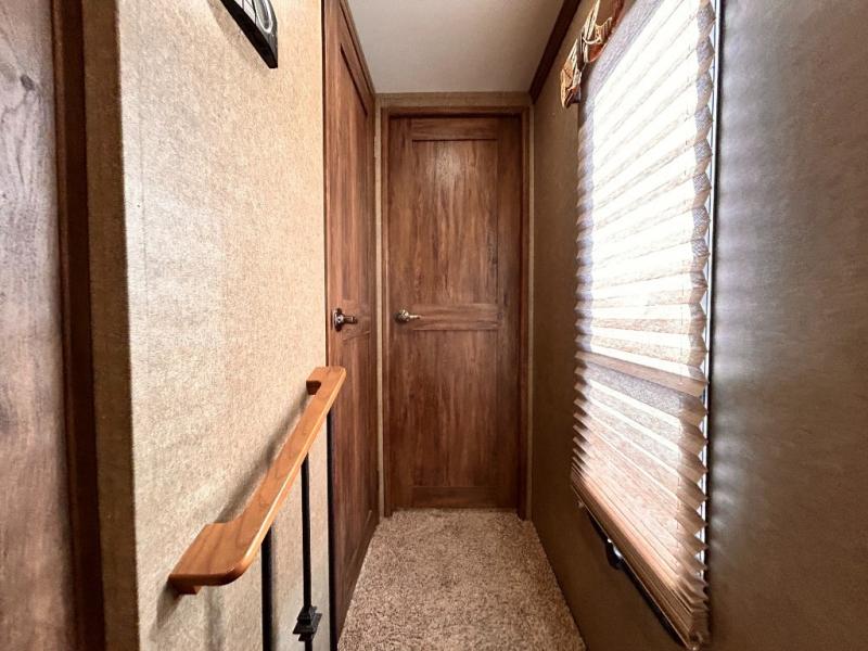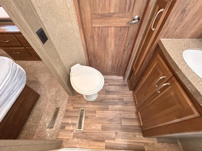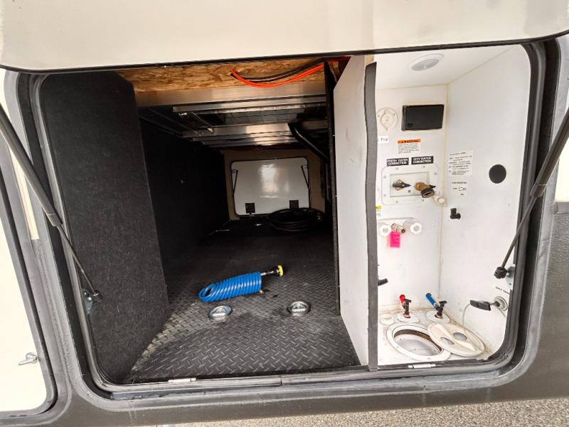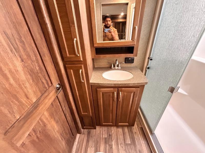 The front private bedroom provides a comfortable place to relax and rest up for the next days adventure. There is a king bed slide, chest of drawers opposite the bed, and front closet with sliding doors. You will also find a washer and dryer closet with drawers, plus so much more!