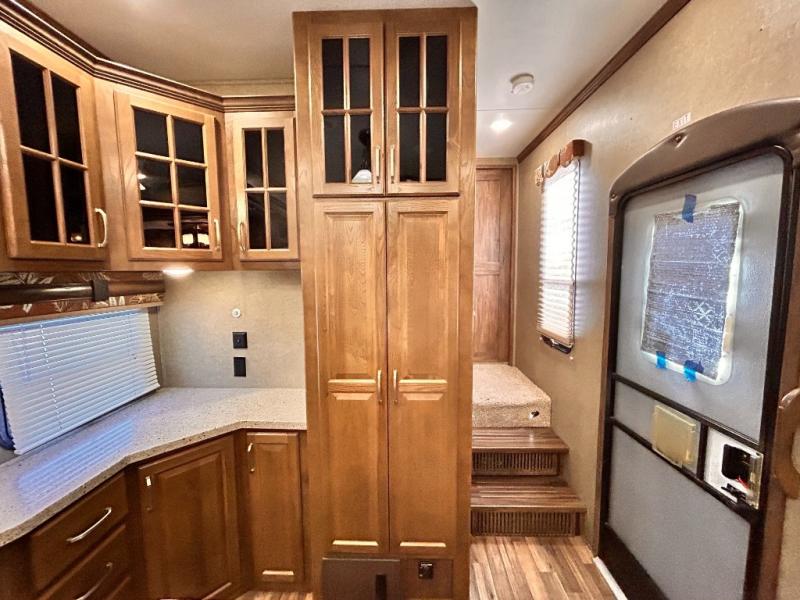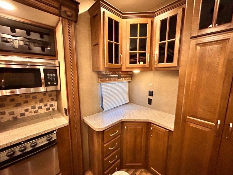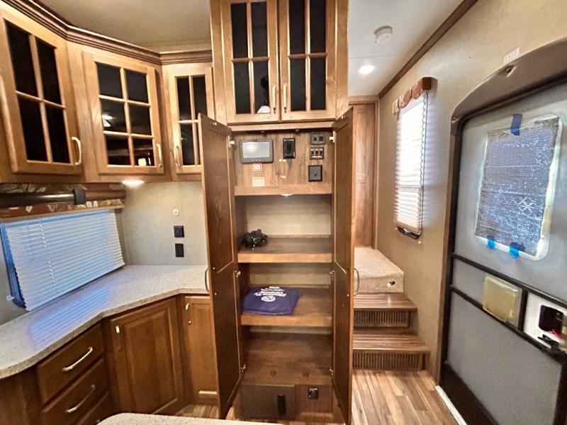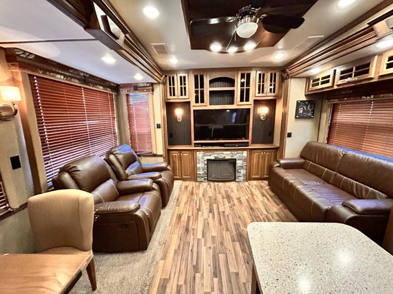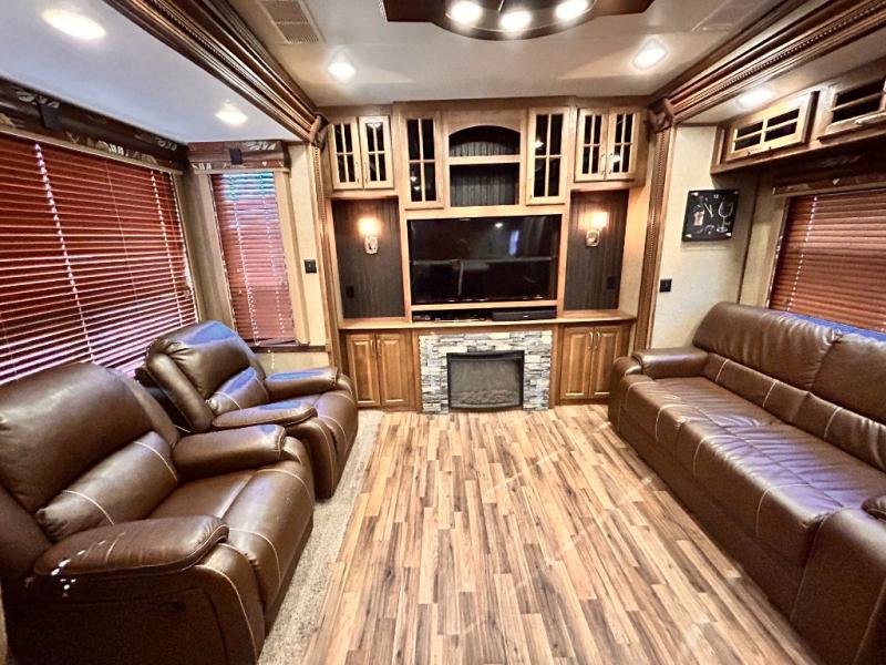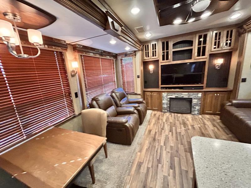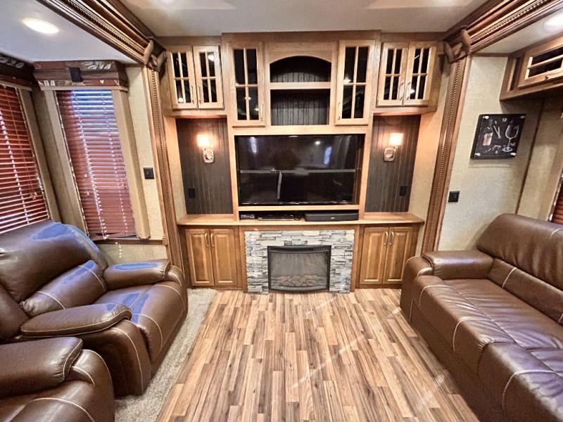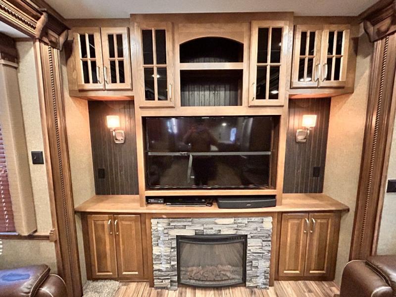 The rear wall features a full entertainment center with a fireplace, overhead cabinets and base cabinet storage. Not to mention the huge LED TV!
