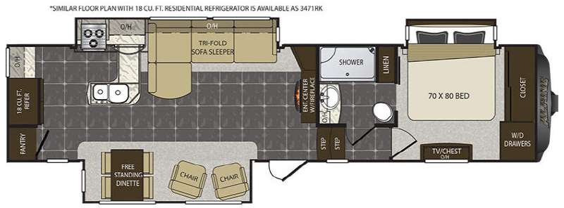 This rear kitchen Alpine fifth wheel by Keystone RV is the perfect unit for those who enjoy being able to entertain while camping. Model 3470RK features triple slide outs for added interior space, a king size bed, a fireplace, plus more!