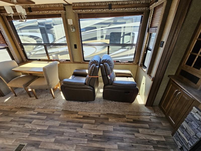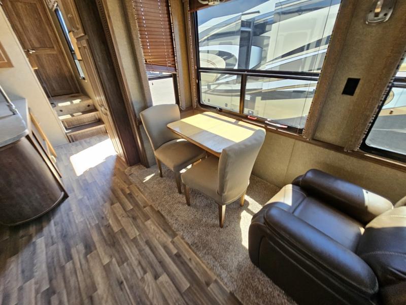 A free standing dining table for four sits just around the corner from the pantry in a slide out along the wall. There are also two lounge chairs within the slide as well. Directly across is a another slide that features an L-shaped tri-fold sofa sleeper with storage above. The entire rear wall serves as an entertainment center with a fireplace below, plus storage cabinets both above and below.