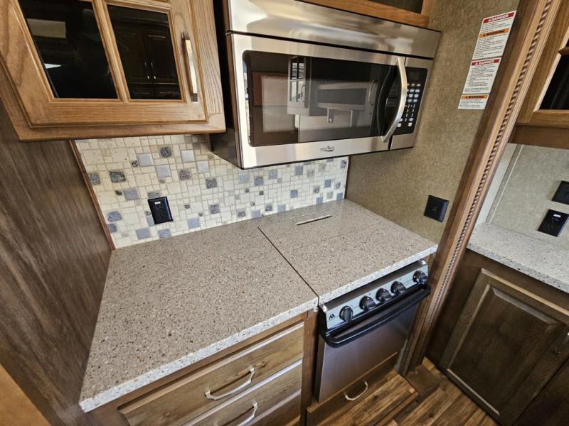 Not only will you be able to entertain guests easily, but cooking in the kitchen provided will be a breeze as well. As you step inside there is a counter peninsula with a double sink plus storage. In the slide out behind the counter you will find a three burner range, overhead microwave, and that large double door 18 cu. ft. refrigerator. There is also a storage pantry for your food items located just inside the door on your left.