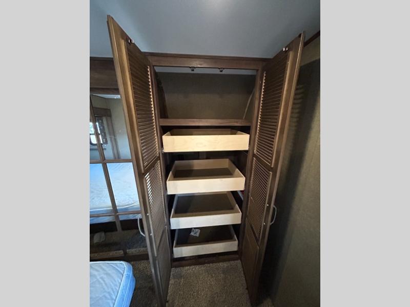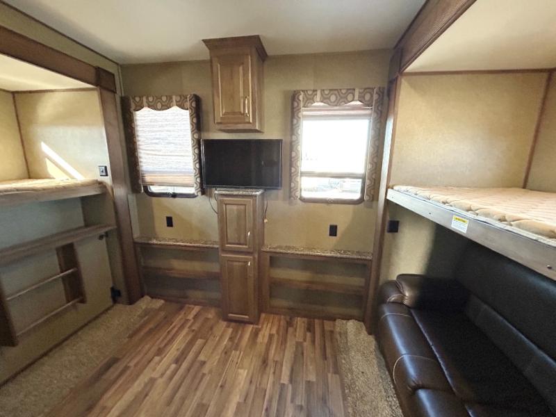 Head toward the rear of this model and your kids can have their own space in the rear bunk house. There are slides on either side of the room. One slide has a tri-fold sofa sleeper with a flip bunk above. The slide opposite has a set of bunks. Near the bunks you will find a half bath with a private entrance door which leads outside. Along the rear wall of the room there is an entertainment center with shelves on either side.
